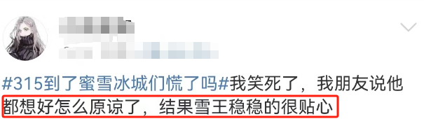 如果说听花酒的315公关是硬刚式,那蜜雪冰城的公关可以说是饭圈式。