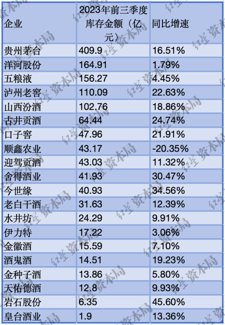 据红星资本局统计各家上市酒企公布的财报,截至2023年三季度末,20家上市白酒企业存货总额为1363.54亿元,其中有多家酒企的库存超过百亿元。相比之下,2020年,上市白酒企业存货总额为985亿元。