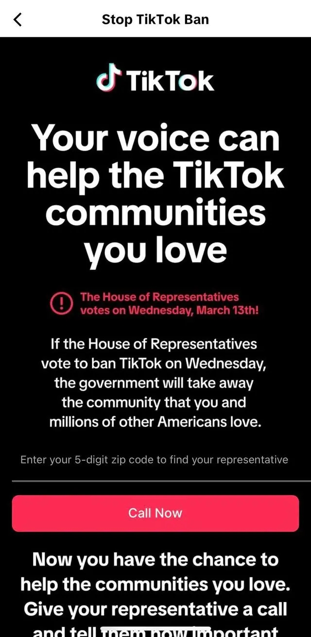 二是TikTok一改过去常态,做出了强硬反抗——TikTok在投票表决前就向用户推送了开屏信息,表示该软件可能会被美国国会立法封禁,呼吁用户反对该法案。