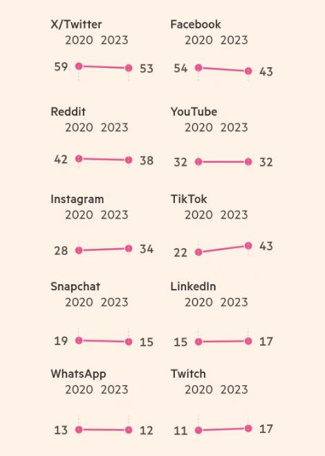 图为《金融时报》统计的各大社交软件用户从中获得新闻资讯者所占比例,TikTok从2020年的22%跃升至去年的43%。