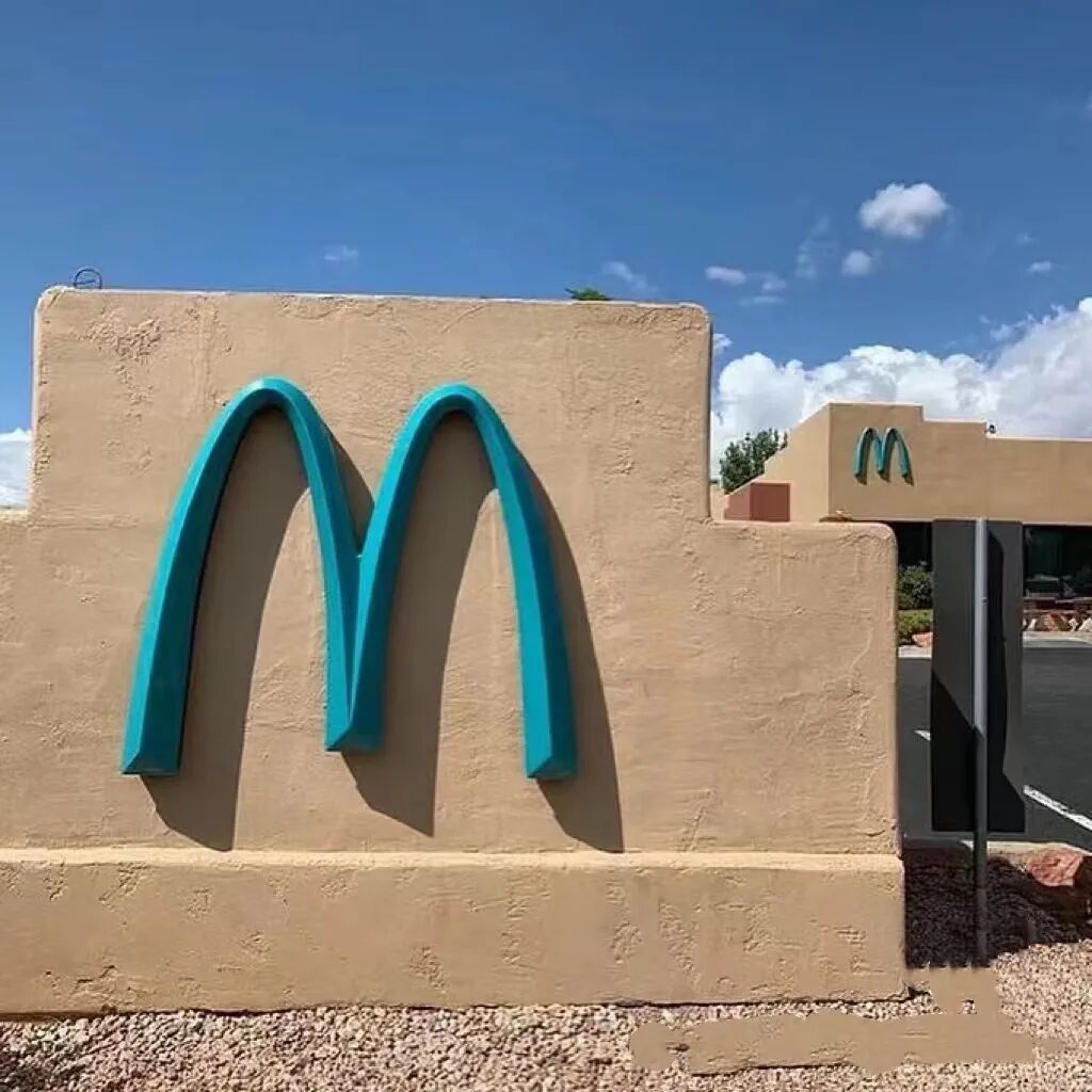因为当地政府规定商店和街道不允许使用和周围环境产生冲突的颜色,美国亚利桑那州门店成为了世界上唯一一家有着蓝色logo的麦当劳门店,也成了大家前去打卡的“人造”景点。