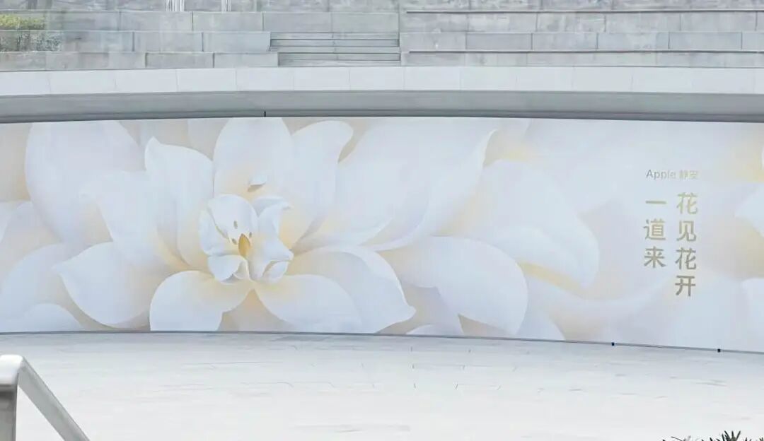 如图所示,为了给这家“等级将仅次于纽约第五大道旗舰店”的新店造势,苹果特地发布了一个将“苹果元素”和上海市花“白玉兰”巧妙结合的全新logo,连周边和围挡也一同安排上了。