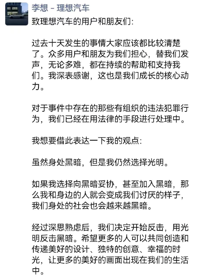 当时,忍了一周的李想没有选择在微博发声,而是在朋友圈连发两段文字强调自己的坚持,回击外界的黑手,还称“我们决定开始反击,用光明反击黑暗”。