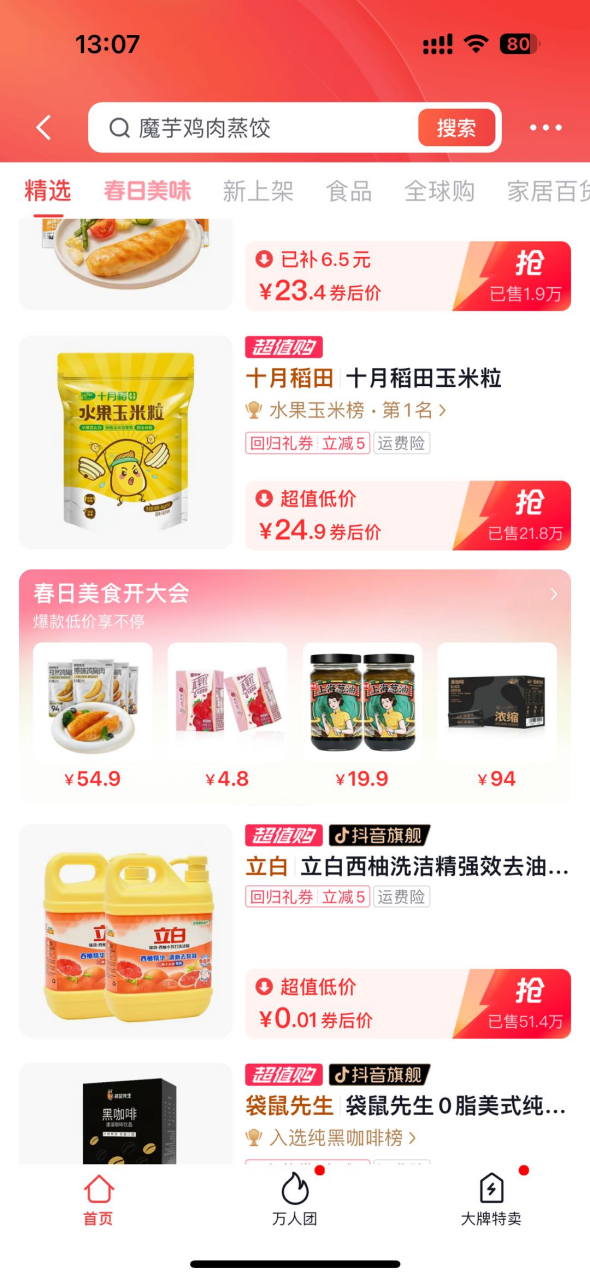 在搜索、商城等场景下,提供不同程度的流量曝光,快速承接“人找货”的需求,进而推动生意转化。其中,为缩短决策路径,搜索场景下关联活动页面或爆款商品,用户搜索“春日美味”相关内容,均可进入活动页面或品牌直播间,在海量的货品资源中快速找到心仪的产品,反之,也让“好产品”快速匹配到“对的人”。超值购频道则设有“春日美味”专区,进一步加码优价好物,满足用户对“性价比”的追求。
