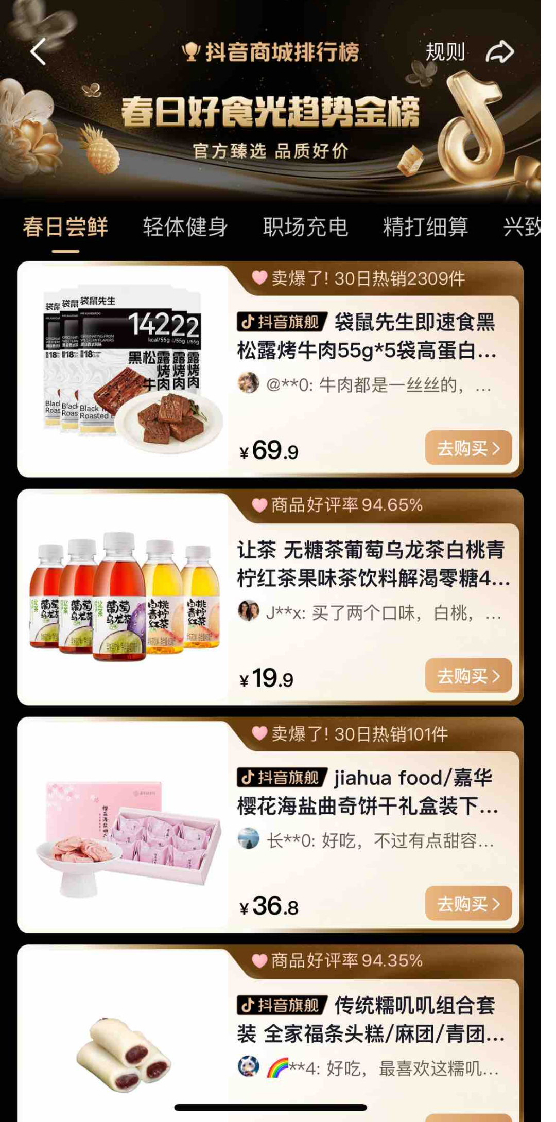 比如,为助力用户更好决策, 抖音电商契合趋势金榜在站内输出“春日好食光趋势金榜”,通过用户需求场景下的爆品推荐,以“好吃不贵”、运费险等关键信息抓住用户心智,提高转化效率。