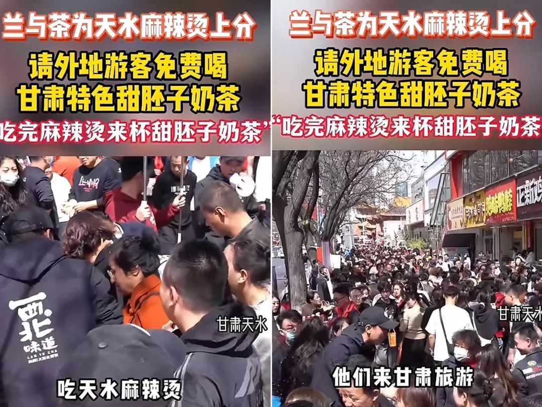 “吃麻辣烫来杯甜胚子奶茶!”“请外地游客免费喝甘肃特色甜胚子奶茶。”