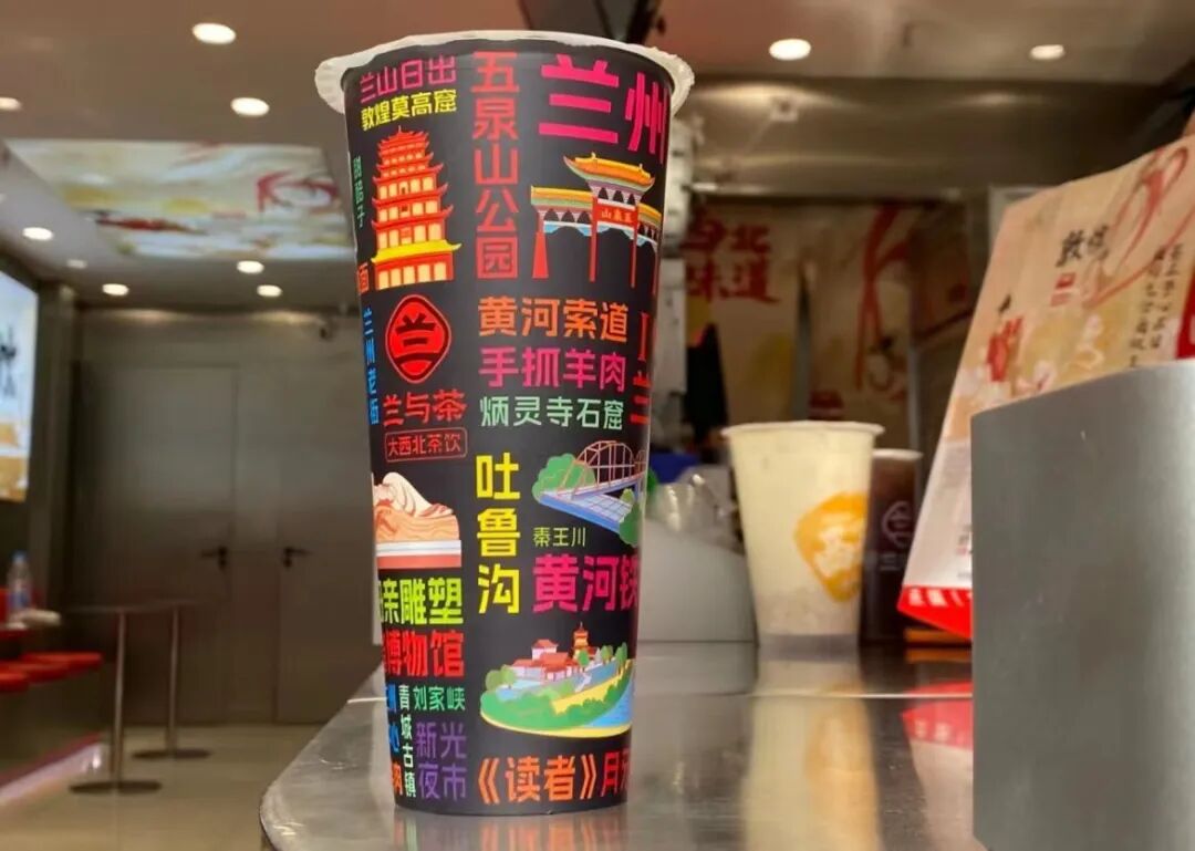 包材也突出西北特色,杯身不仅画上了甘肃的著名景点,还一一列举当地特色美食,比如中山桥、黄河铁桥、手抓羊肉、兰州拉面等,不少网友戏称“去甘肃旅游看杯子打卡。”