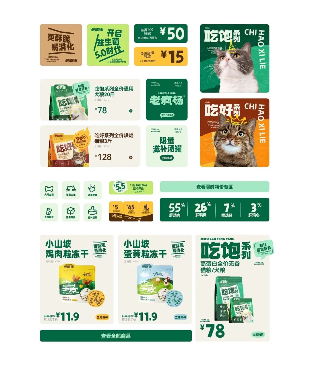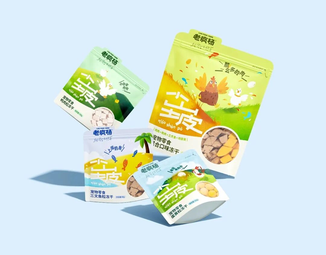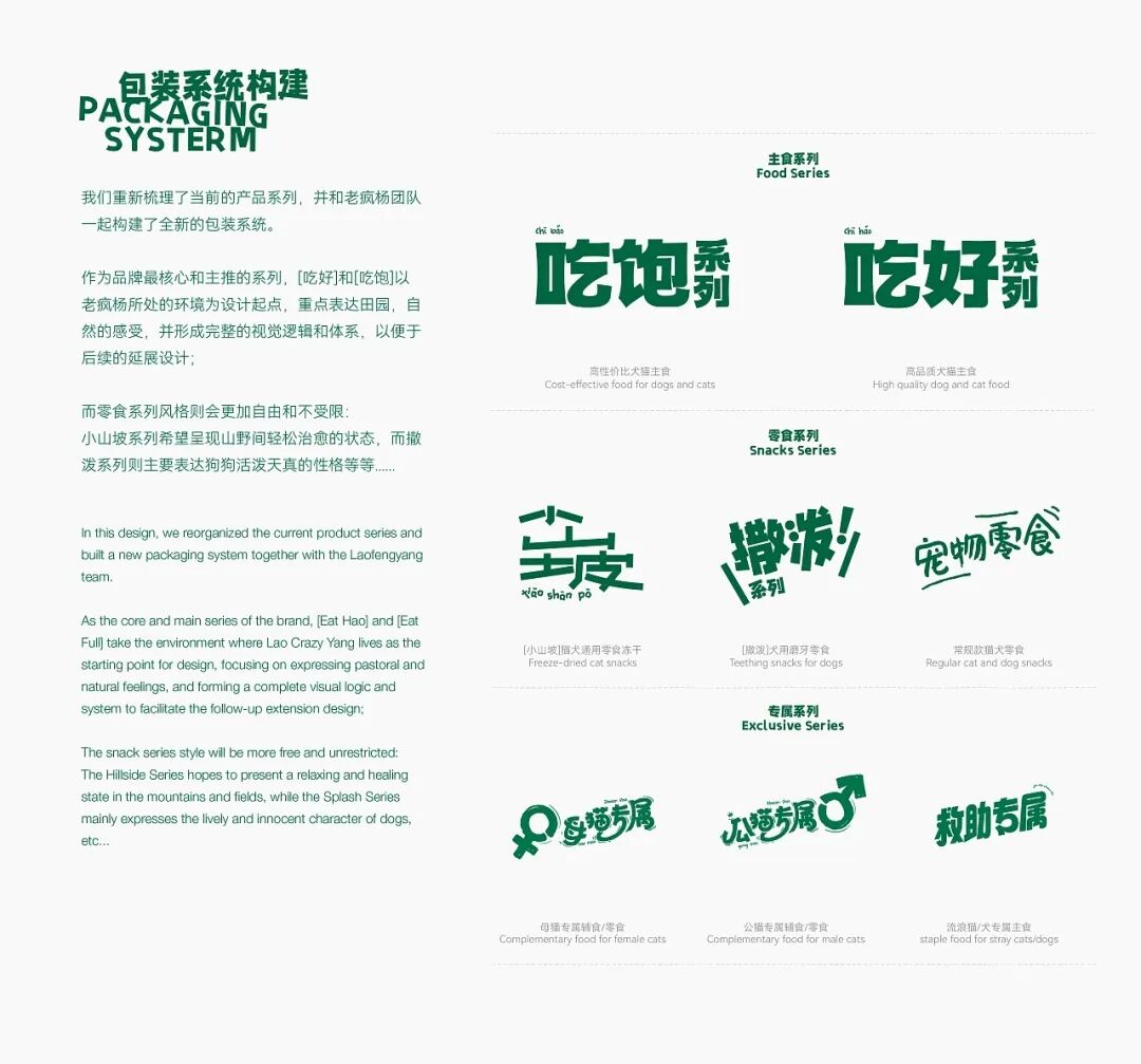 作为品牌最核心和主推的系列,「吃好」和「吃饱」全新的包装系统以老疯杨所处的环境为设计起点,重点表达田园、自然的感受,并形成完整的视觉逻辑和体系;零食系列风格则会更加自由和不受限:小山坡系列希望呈现山野间轻松治愈的状态;撒泼系列则主要表达狗狗活泼天真的性格等等......