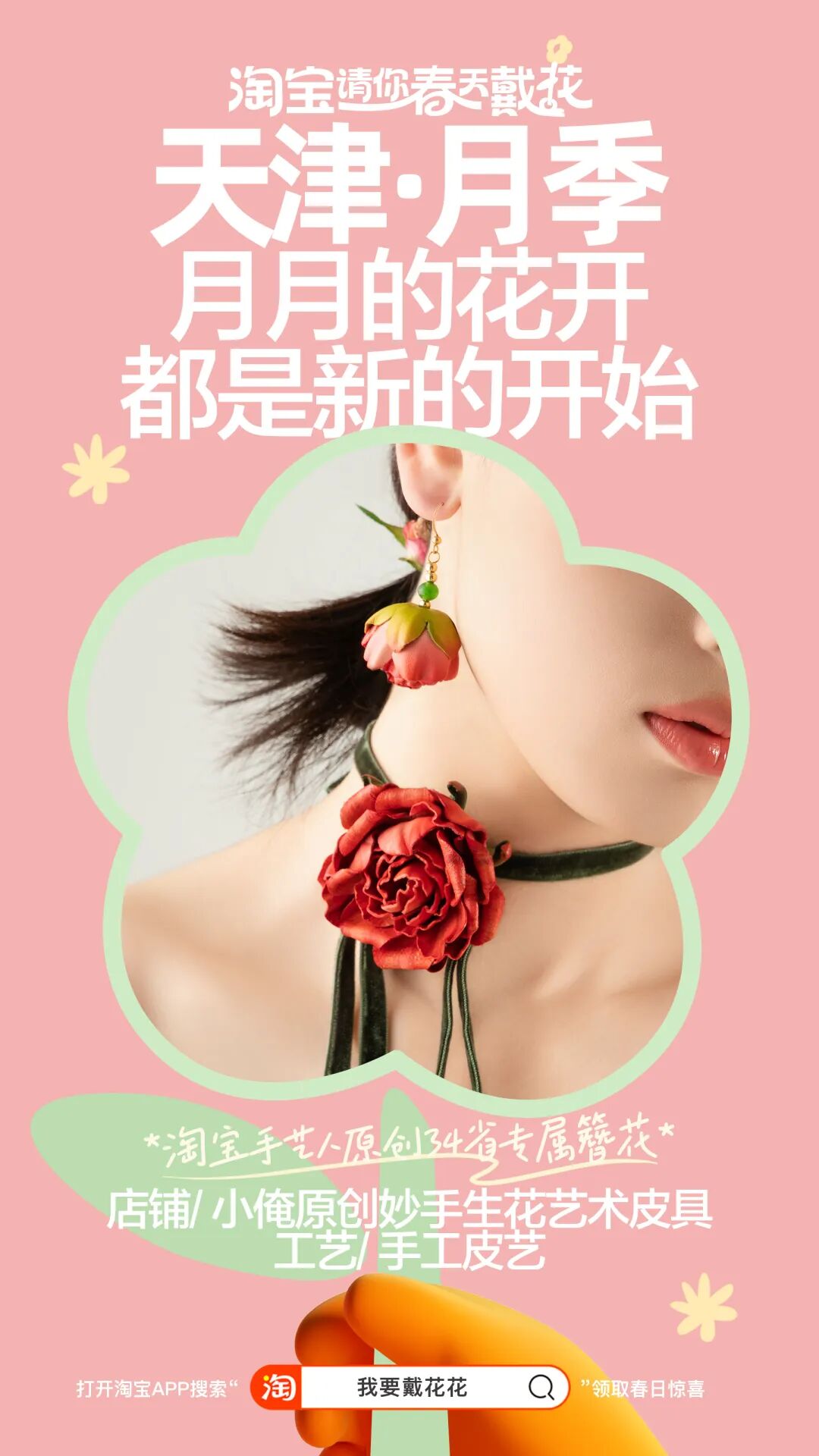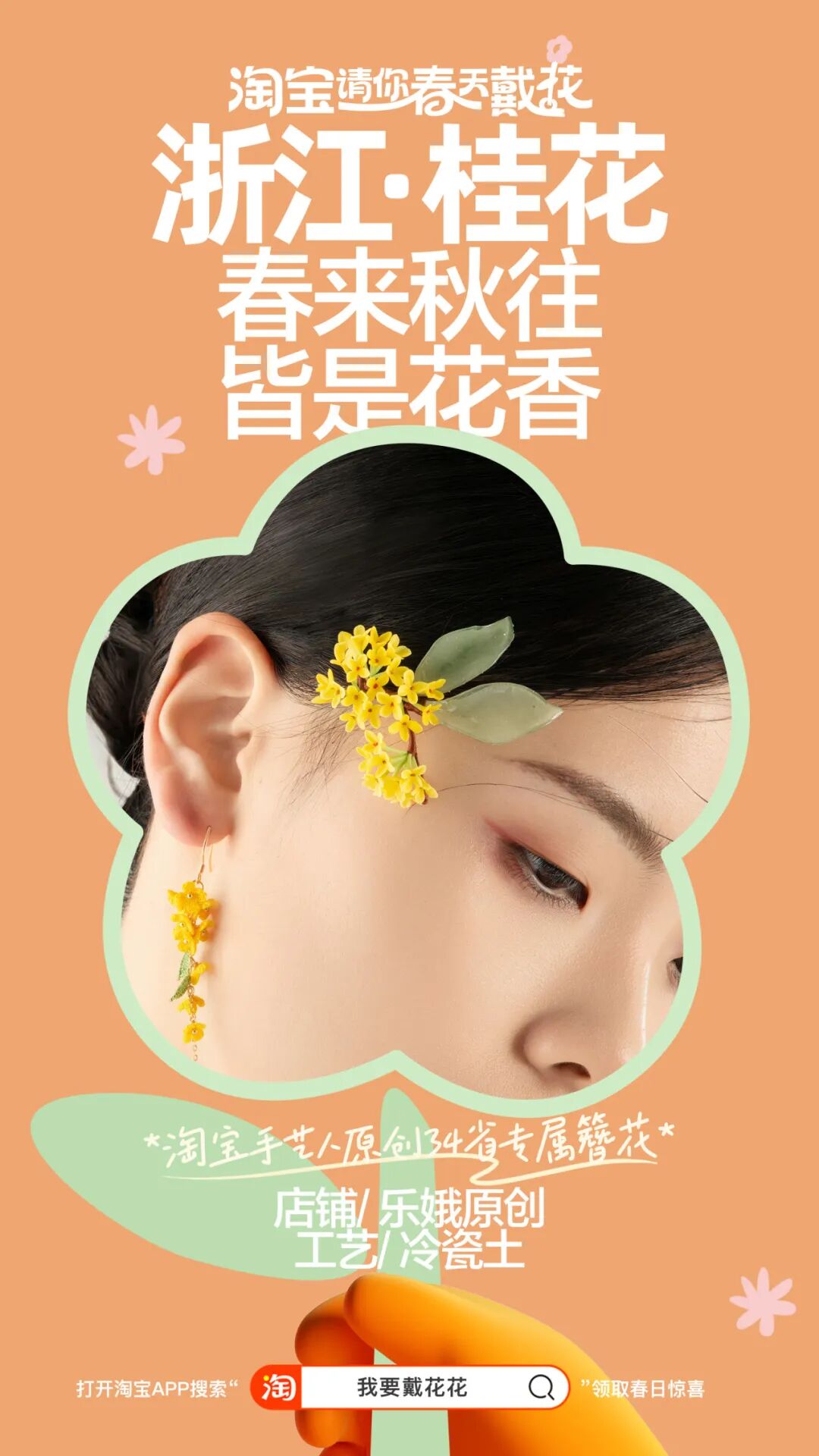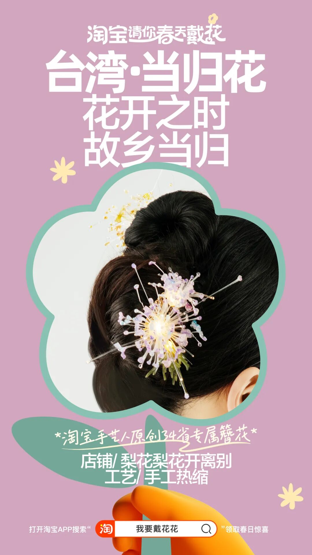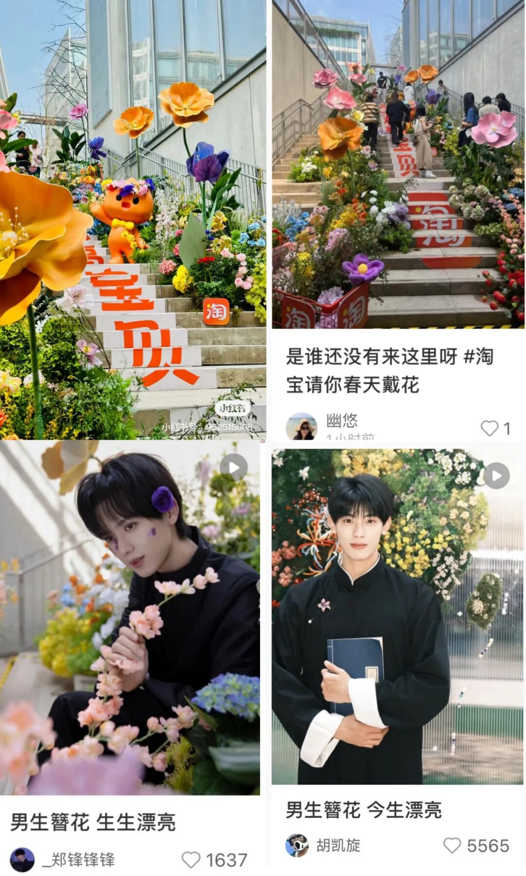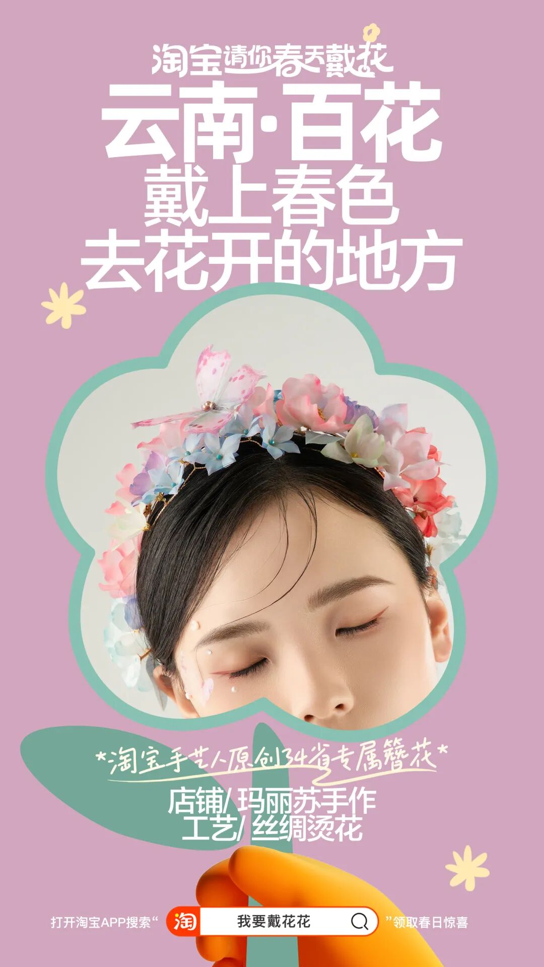出于营销人的“职业病”,我顺着网线稍微扒拉了一下,原来这是淘宝整花活,发起的一场“淘宝请你春天戴花”活动,用一种充满春日仪式感的方式请用户戴花。活动联合了34位手艺人,纯手工制作了这幅中国簪花地图,每个省份都由当地的代表花朵簪满,而且周围更是悬挂了定制的“省花”风铃。截止到今天,从线上到线下,从站内到站外,这场春日的全民戴花风潮,已经愈演愈烈了。