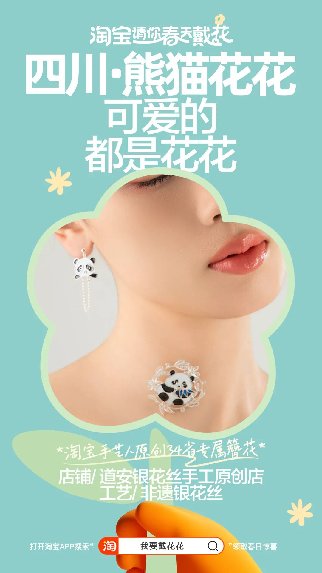 淘宝店铺“小黄香蕉手钩”手工编构工艺的江西·油菜花,设计发带和耳环,淘宝特色店铺“玛丽苏手作”通过丝绸烫花工艺打造云南·百花发箍,“道安银花丝手工”原创店店主自身完成了四川熊猫花花。