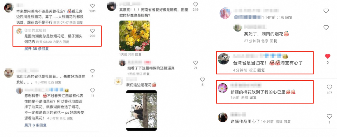 尤其有几个省花的选择还是让我感觉到了特别的心思。不少网友显然纷纷在评论区留言讨论:“湖南橘子洲头烟花”、“台湾省是当归花,淘宝有心了”、“这幅作品用心了”、“新疆棉花软到我的心巴里”…… 看的出来,这是营销的新意,也是淘宝的心意。
