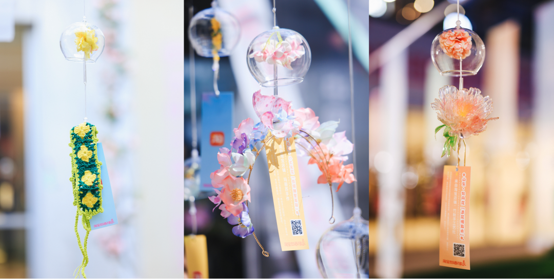而另一方面,则是地图装置周围悬挂的风铃,将34家手作店铺打造的精品一一展示,将淘宝店铺推到台前,被更多的用户认识、了解并喜爱。其中有不少省花的设计、工艺都让我眼前一亮,记忆深刻。