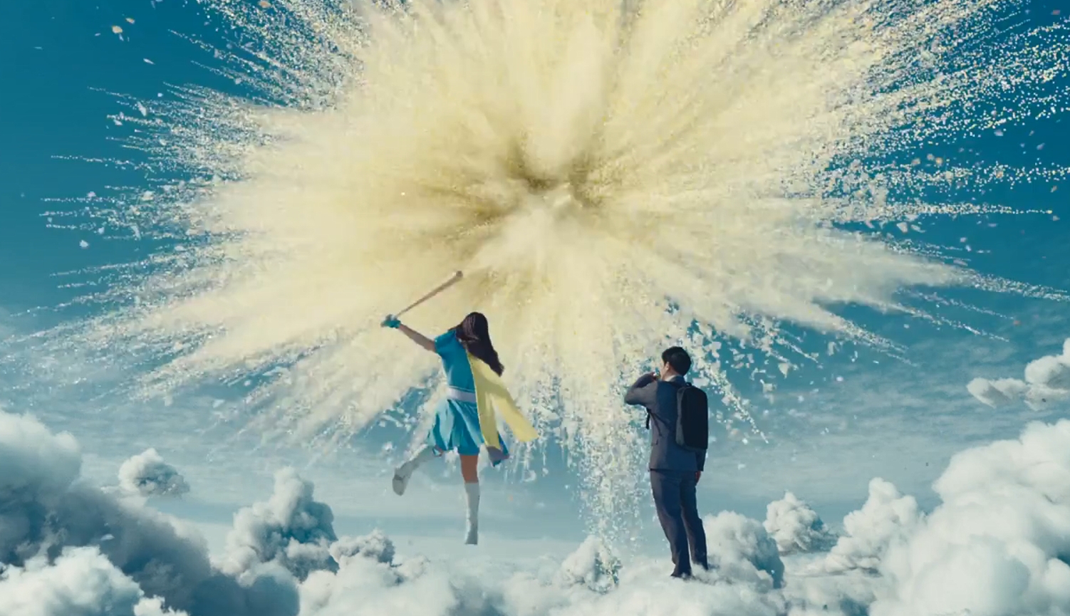 第一支广告内容:本是常规的工作汇报现场,然而误入的一张合照,让台上的他惊慌失措,尴尬不已,直到走在回家路上,仍然十分苦恼。突然,一个女超人从天而降,给出-196起泡酒,冲散所有烦恼。