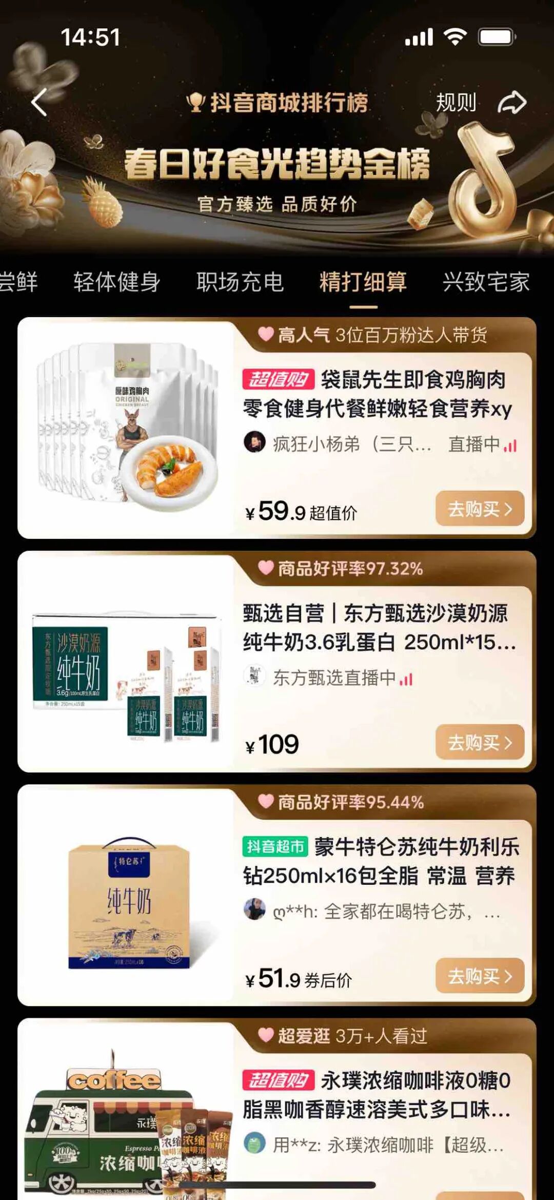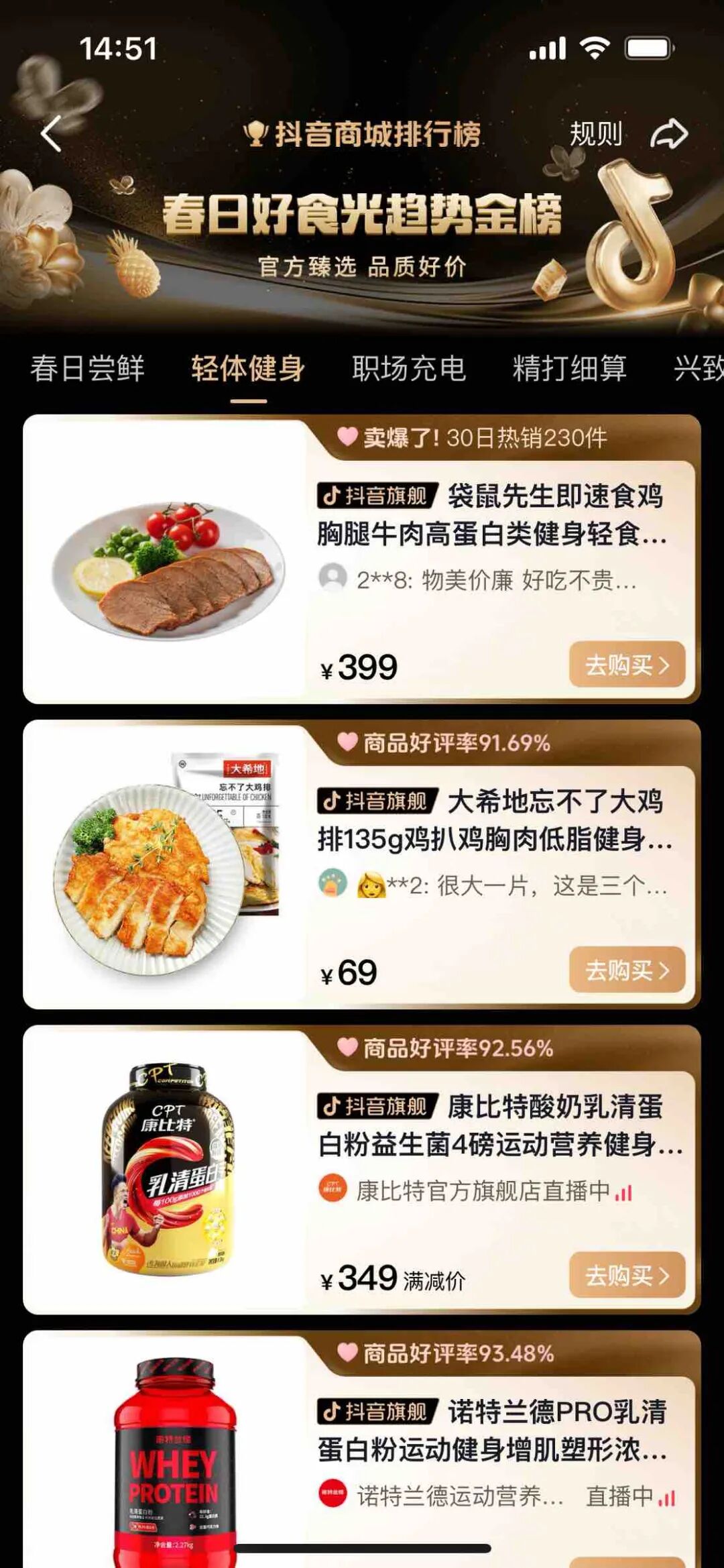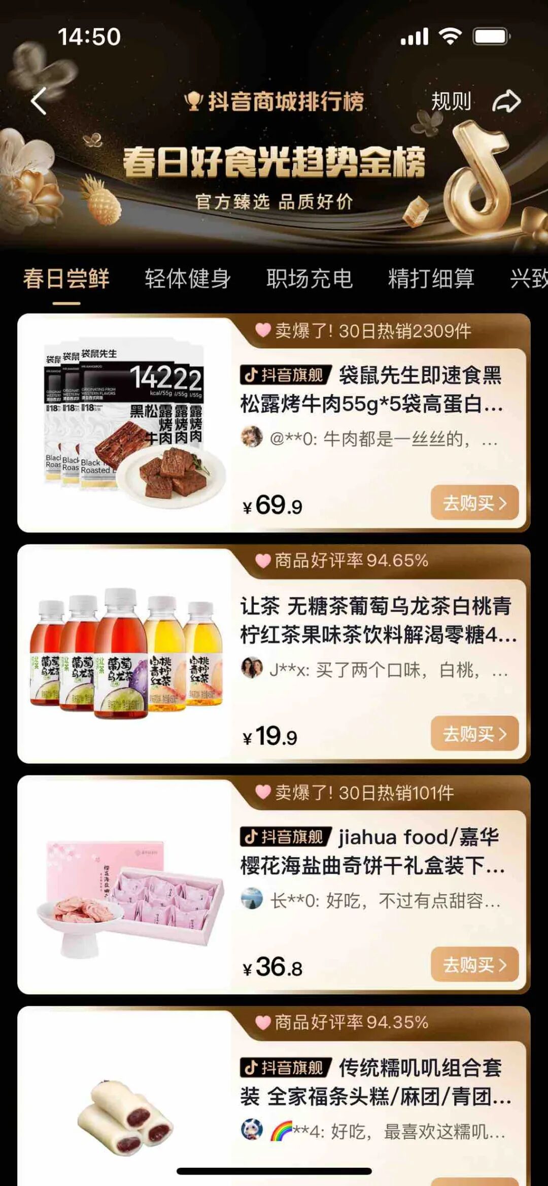 明星之外,抖音电商还发起#春日美味上天了 话题,邀请多位不同创作区域的代表达人,充分发挥平台的内容种草优势,聚焦春日减脂餐、春日限定美味以及春日出游等各种场景,向用户展示并种草不一样的春日美味,唤醒用户消费渴望。#春日美味上天了 话题上线即收获超6000万人观看,斩获抖音热榜与种草榜双料Top1,进一步向兴趣圈层进行触达,驱动消费决策。