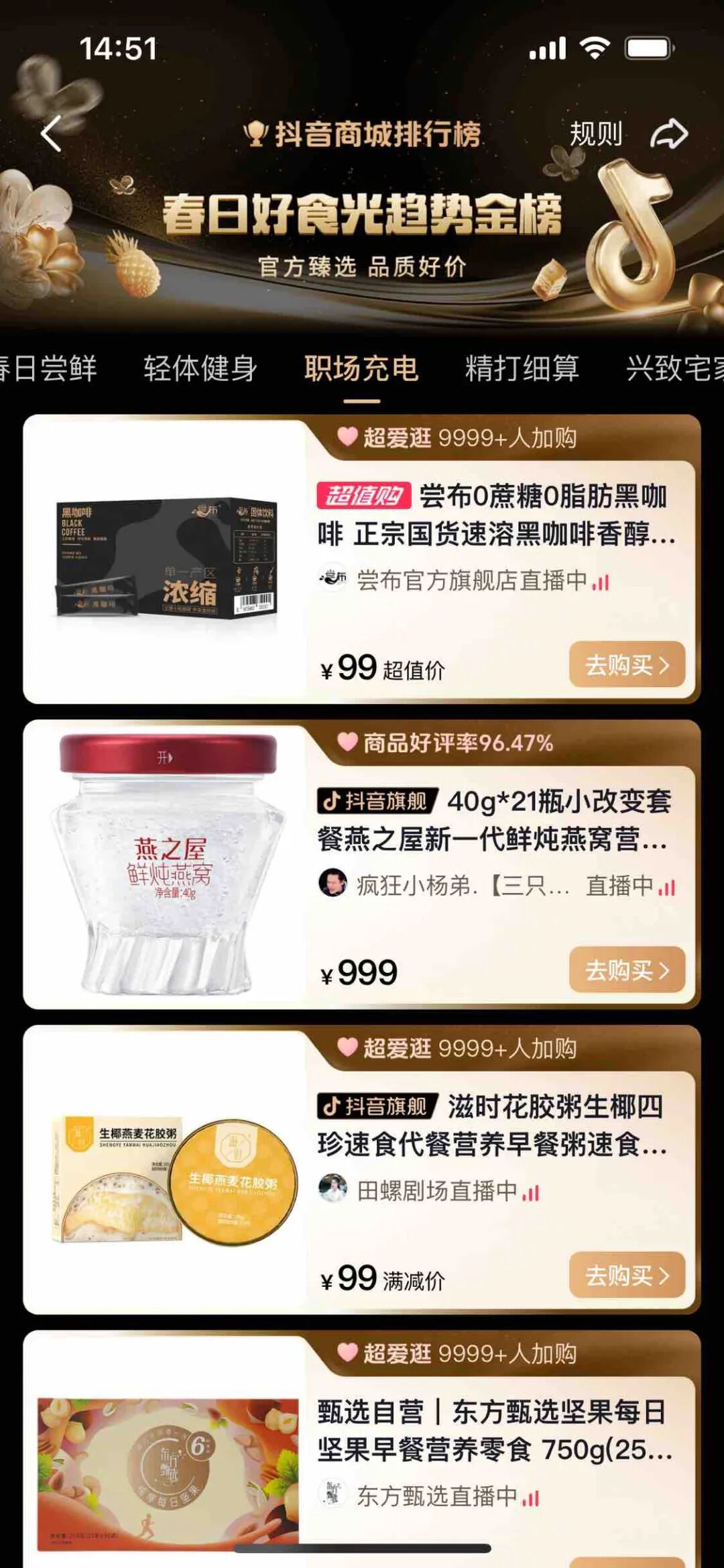 当然,活动的成功离不开消费人群的聚集和爆发。抖音电商在这一点上也提供了一个好的样本:第一,一场全网热议的battle,花样种草带动优价好物强势出圈平台数以亿计的日活用户为爆款的诞生提供了天然的土壤。在此基础上,抖音电商“以爆品带品牌”的核心策略,举办新星美味“颁奖会”。一方面,对有价格力的趋势商品,抖音电商通过打造趋势金榜让它们被更多消费者看见,并助力交易成交,集中释放了一波爆品爱好者的狂热;另一方面,对有价格力的趋势商家,频道设置 “春日美味” 活动tab 、和商城内搜索干预,加速曝光;通过大盘系列玩法,带动商家参与积极性,带来优价新品与爆品,给用户更多的优价春日美味购物选择。以增长为目标的春日营销,重在产品、营销、传播、渠道多位合一。在产品、营销之外,抖音电商也在布局传播、渠道时,紧紧围绕消费者的心理偏好、行为习惯而展开。明星达人效应,是能同时实现大范围传播与高效转化的途径。看准这一点的抖音电商,邀请明星辰亦儒担任春日美味趋势官,借明星的号召力,并通过与品牌连线以及直播的即时种草功能,高效带动合作品牌进行交易转化。