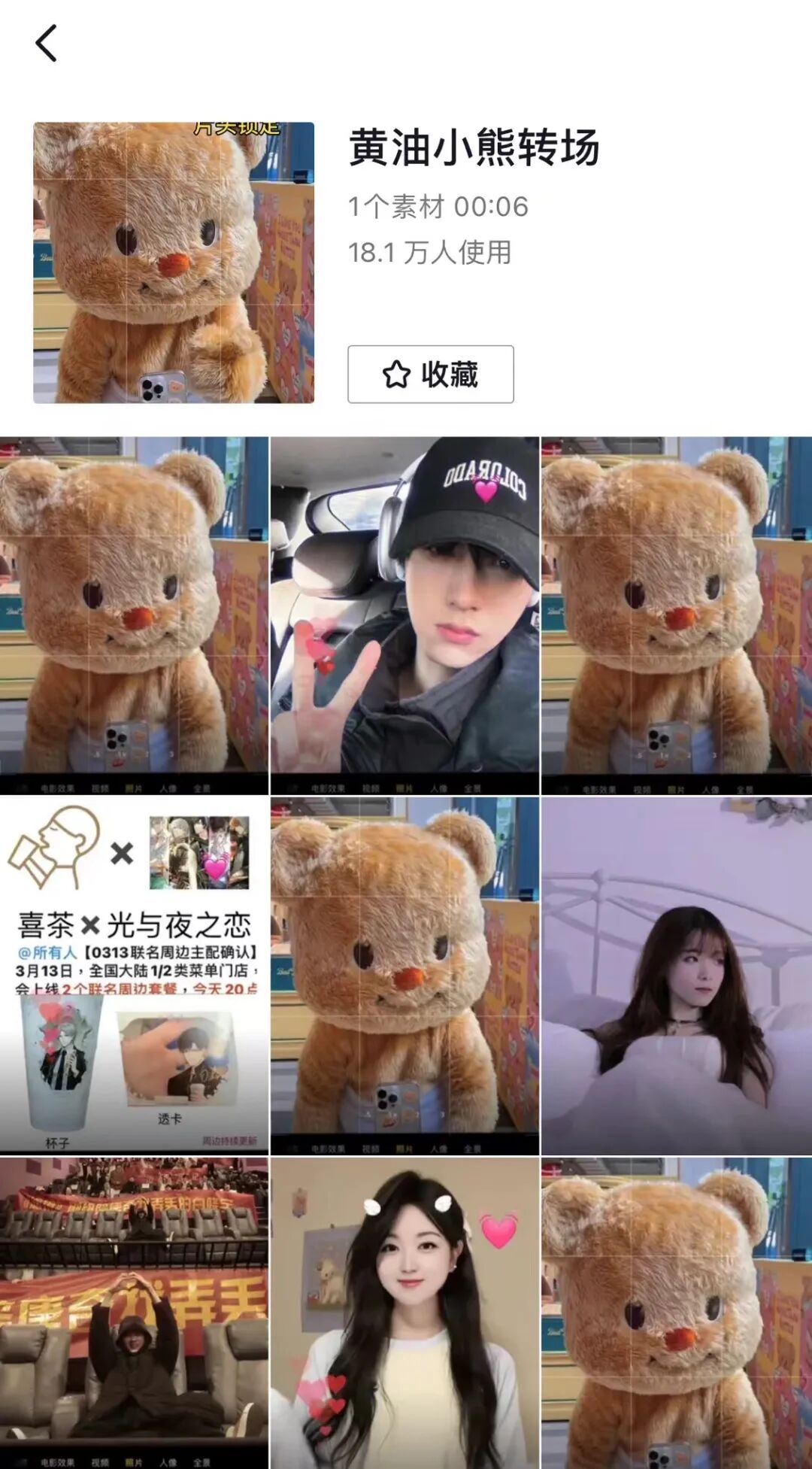 一边,贴合年轻人的“玩法”出现,短视频平台上线了黄油小熊转场,截至今日已有超过18万人使用。另一边,网络热梗融入内容创作,黄油小熊在社交平台上大跳科目三、Flower等热门舞蹈。