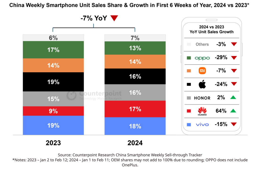 2023年,iPhone还是中国市场销冠,但到2024年情况出现急转弯。Counterpoint Research的数据显示,在中国市场,2024年头六周苹果手机的销量下滑了24%,华为则是逆势增长了64%。
