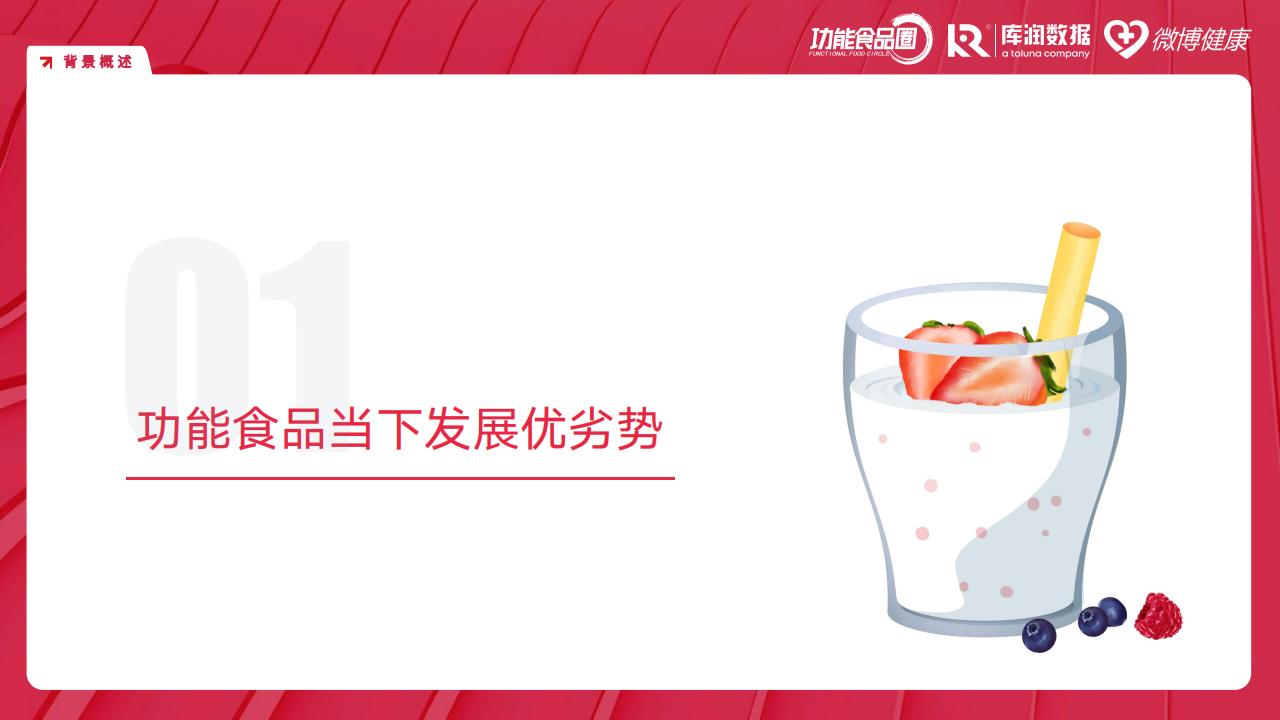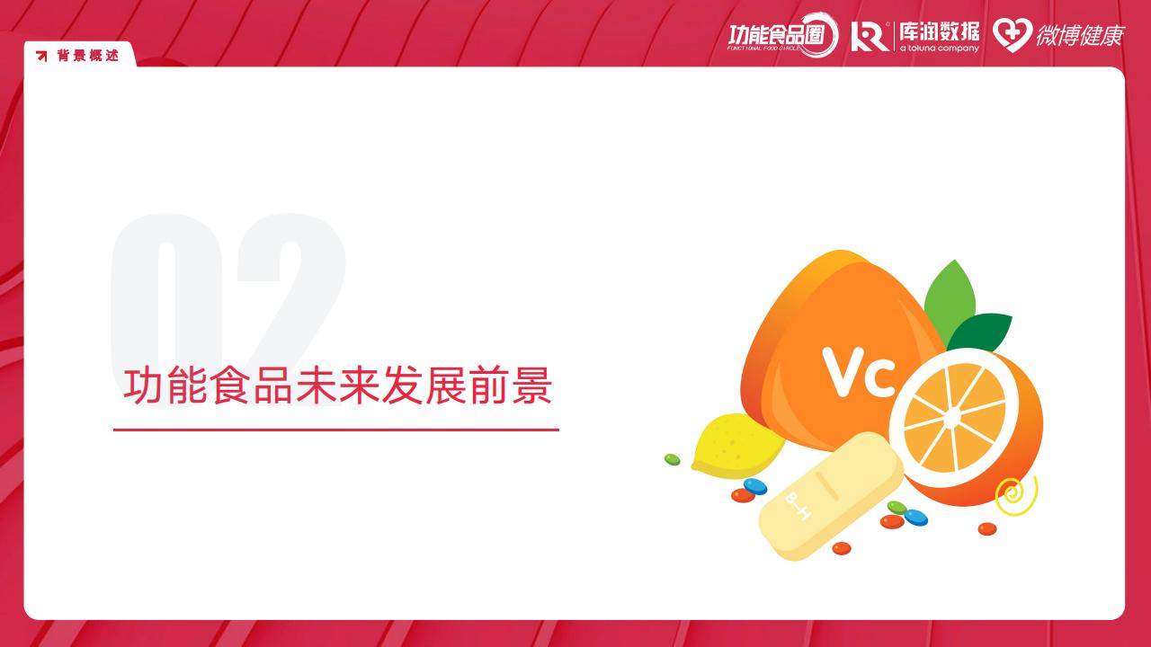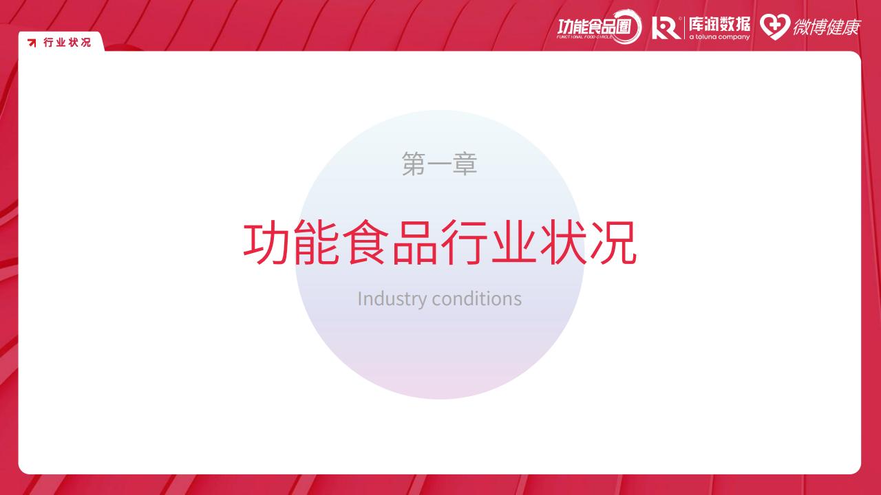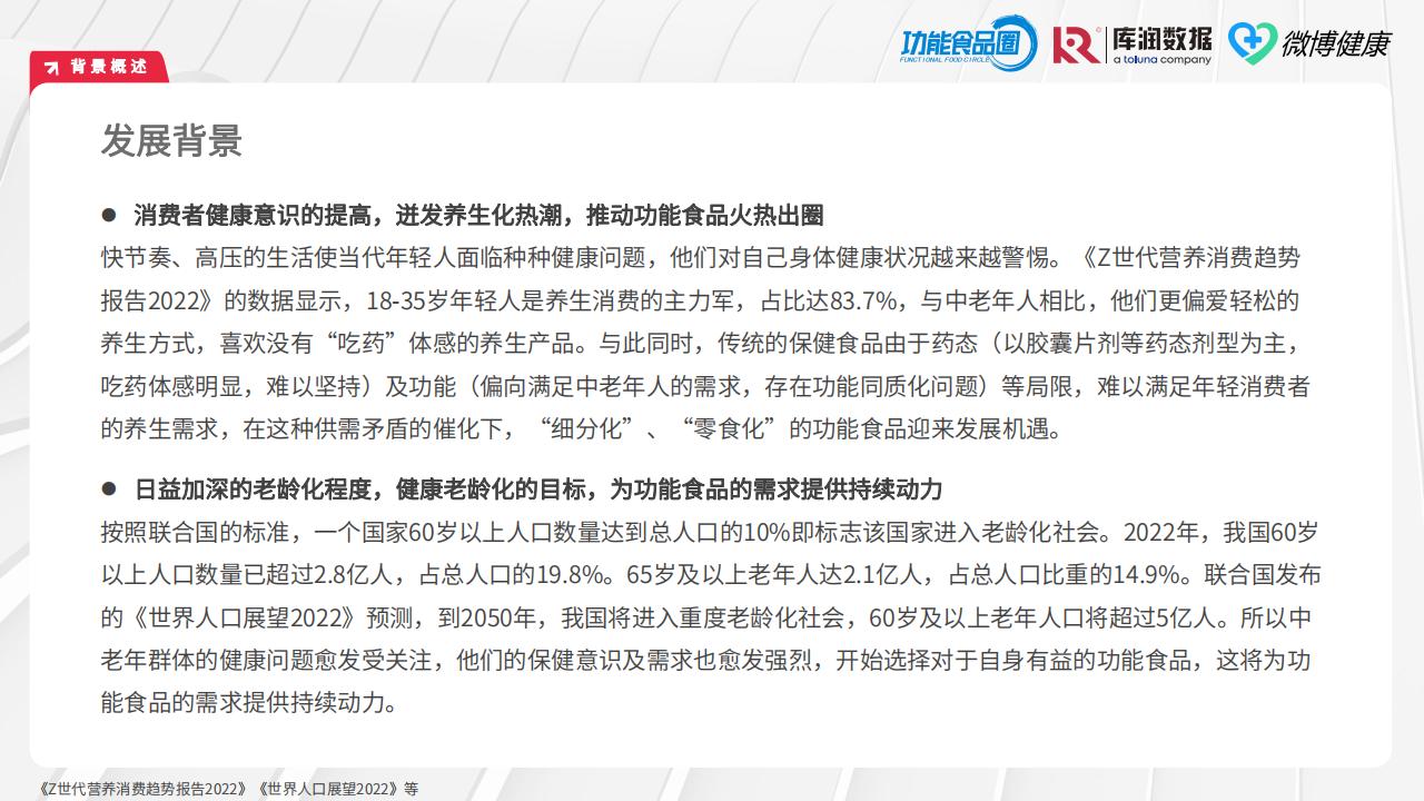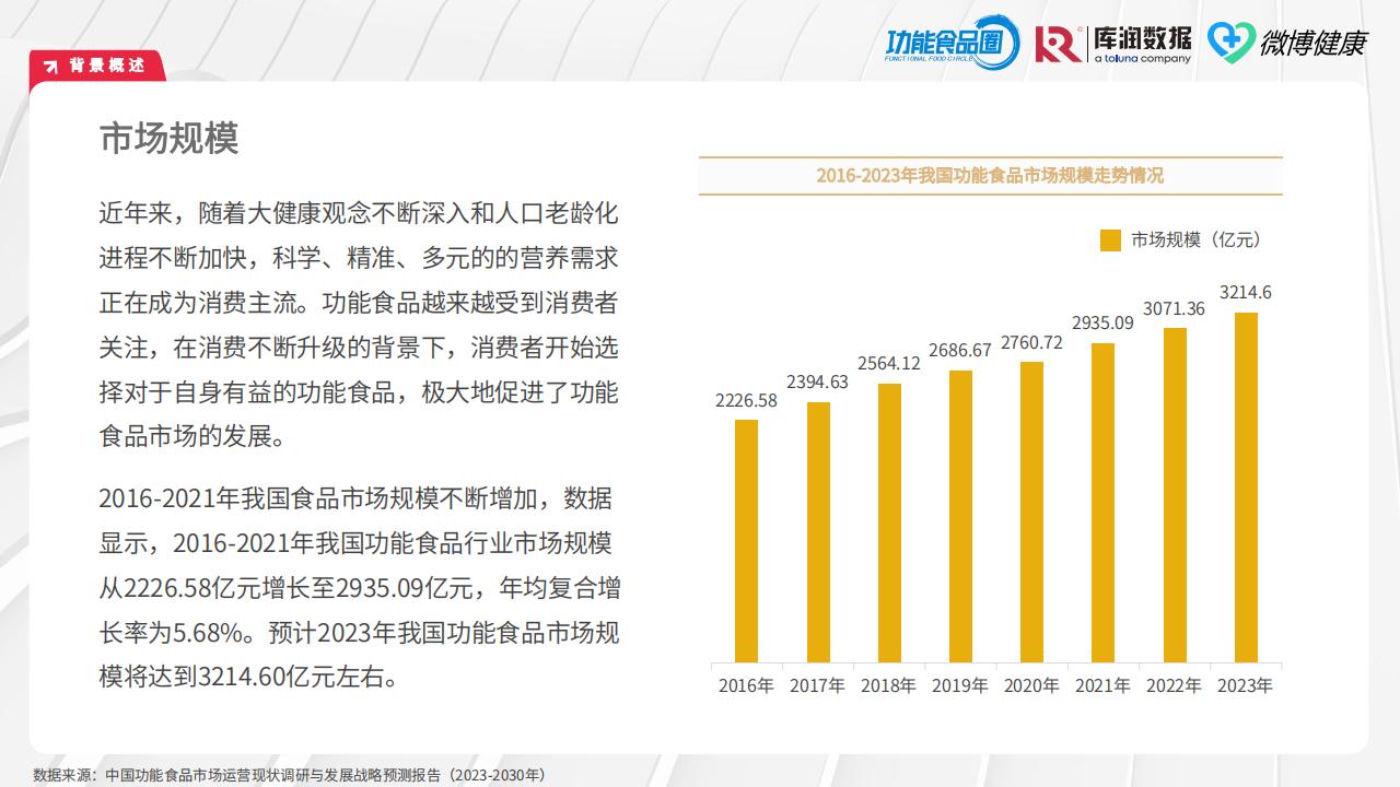 随着国民自身健康关注度的不断提升,年轻人养生常态化及潮流养生理念普及,加之国家多项利好政策的推行,国内功能食品正蓬勃发展。在新的一年,功能食品圈、KuRunData库润数据、微博健康即将联合发布《2024中国功能食品消费者洞察报告》,以下内容将从功能食品行业概况、消费状况及未来趋势详细进行消费者洞察解读。