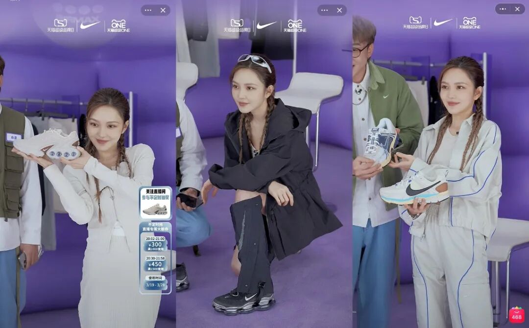 由先疯共创和茶社活动、先疯大秀吸引的产品潜在兴趣人群,又该如何高效转化为品牌销量?对此,本次Nike天猫超级品牌日创新构建“种-收”链路,在社交平台创意种草后,又以场景式的直播穿搭介绍提效转化。