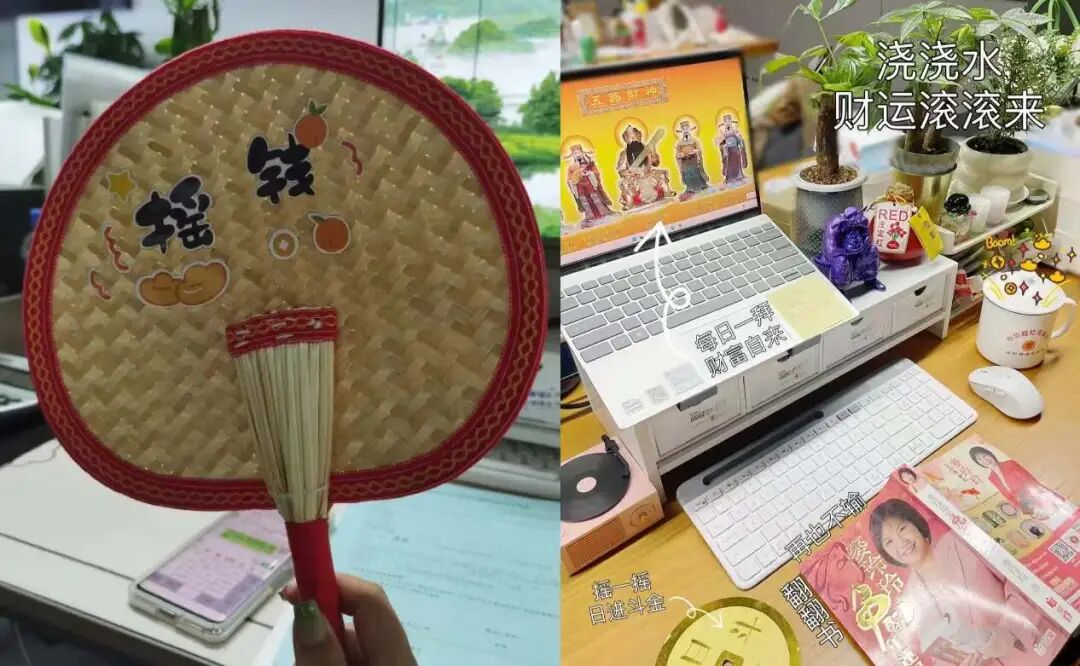 一把写着“摇钱”的扇子,一个金灿灿的“日进斗金”鼠标垫,再配上听说大师见了都说秒的壁纸和头像,打工人就差把发财俩字直接写在自己的脸上。