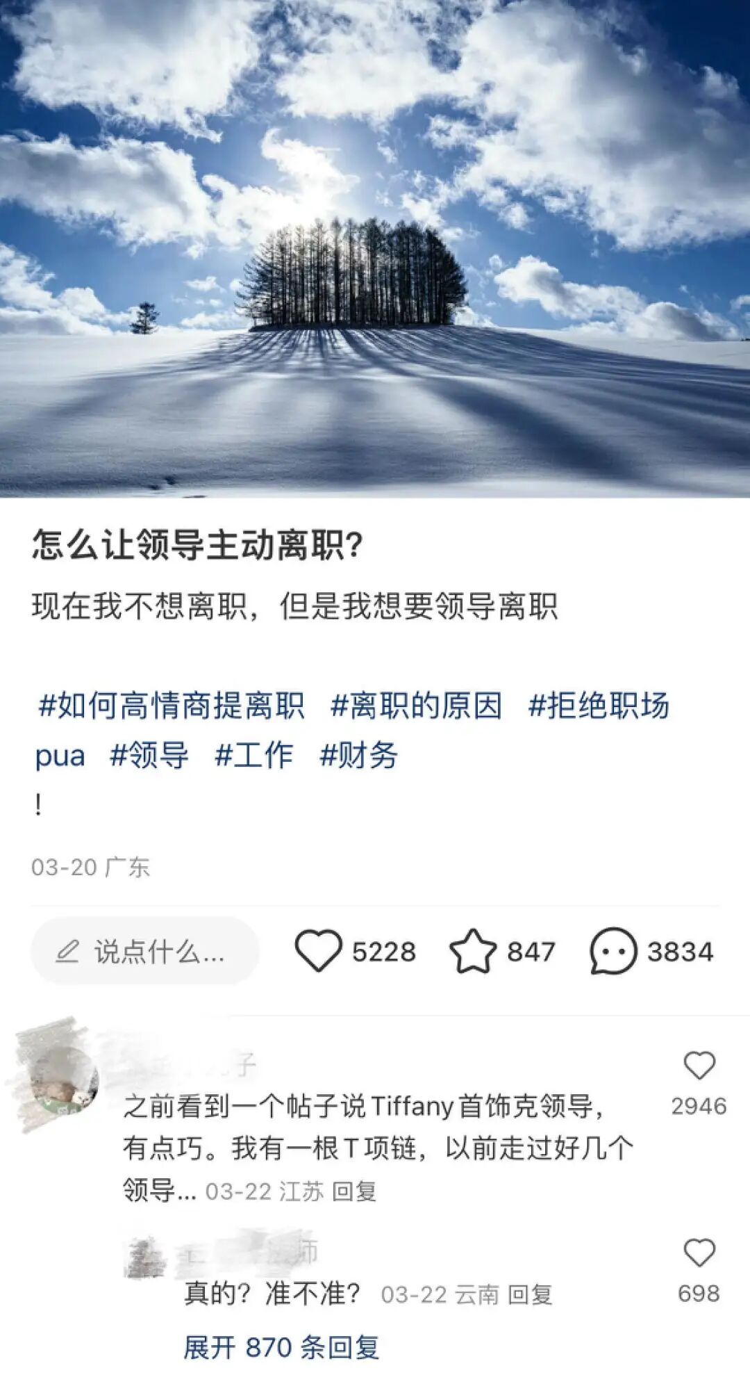 有人戴着Tiffany经典微笑项链,刀起刀落连续送走了3位领导(ps:字面意义上的走);有人看到玄学说法后赶紧把多年前买的T戒找出来,“5天后一个领导住院开刀,一个领导被电瓶车撞”。