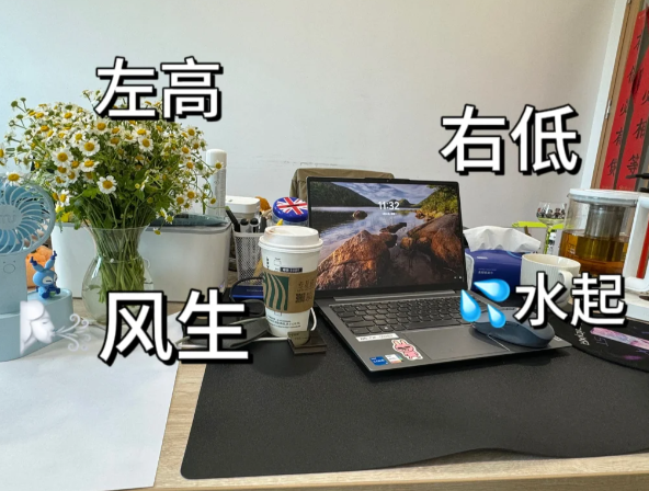 首先是高度,民间大师们指出桌面布局讲究左青龙右白虎,也就是左高右低(也有相反的说法,大师们的观点也不是很一致),再配上左边的风扇和右边的水杯,所谓是风生水起。