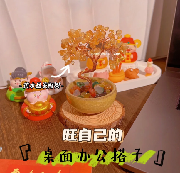 “总体布局到位了,你才能工作顺利。”但是还不够,大师们还建议有能力的打工人在桌面摆上一些颇有讲究的物件,比如一只屁股对着自己的小貔貅,亦或是为紫水晶招财树和黄水晶转运石在你的桌面上搭起一座迷你景观。