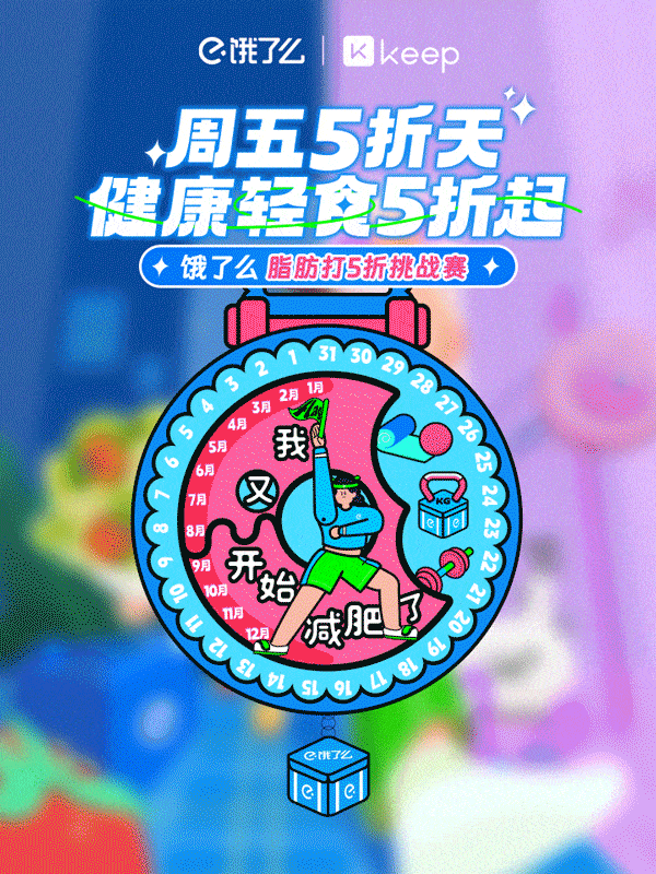 为了充分调动年轻人的参与度,饿了么还和Keep进行了一波站内联动:饿了么×Keep发布「周五5折天,脂肪打5折」挑战赛。