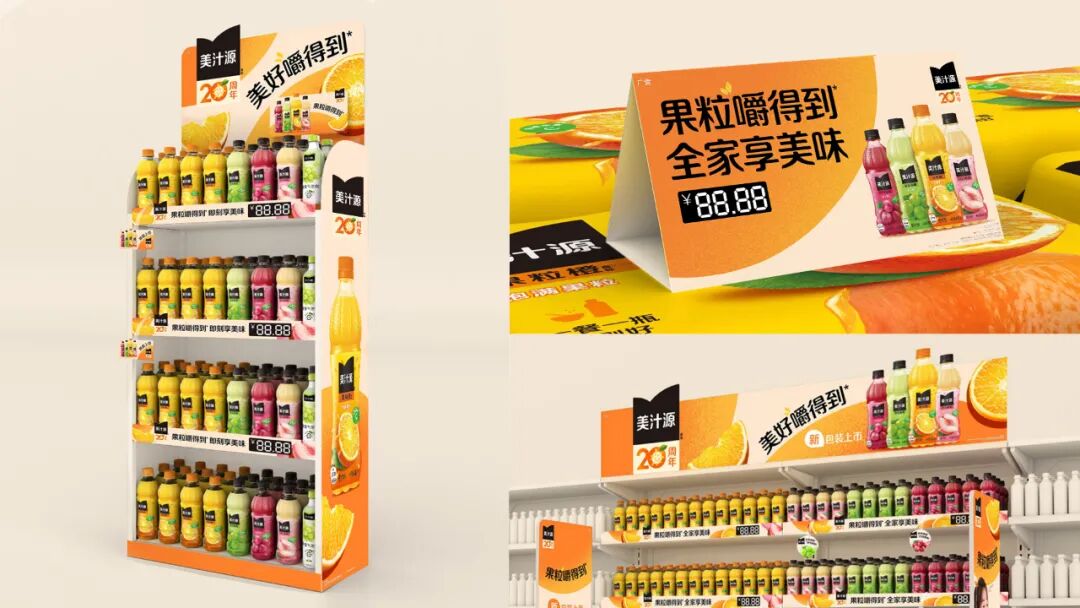 【美汁源】也将全新的品牌视觉形象设计在海报宣传物料、销售物料、周边产品等各种触点进行了全面的延展应用,最大化发挥品牌优势,凸显品牌精神,帮助消费者更便捷地注意到【美汁源】产品并进行浏览与决策。