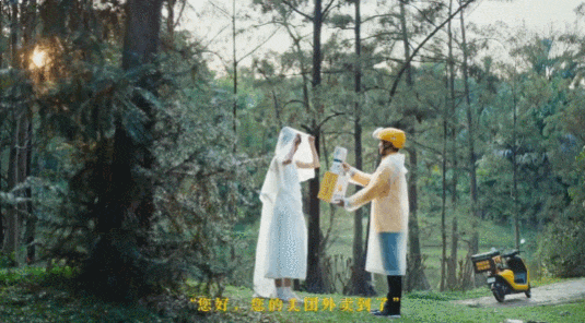 《断气》篇中,你以为一袭白衣的女孩在突如其来的春雨中奔跑是去奔向自己的爱人,其实她自己匆忙的去拿外卖员送来的帐篷去和好姐妹露营。看明白了吗?前后反差所制造的“期待落空”不仅喜剧效果拉满,而且记忆点深刻。这也是我觉得美团外卖比较高明的地方——喜剧外衣的包裹下将品牌的信息点与诉求隐藏起来,但反转来的那一刻又令人印象深刻:《鲜花》篇春日出行个人防护场景中,“上美团外卖买屈臣氏”的传播点一出现,立刻消解了短片前半段所烘托的气氛,在会心一笑中记住了春日踏青可以在美团外卖买防护产品的信息点。