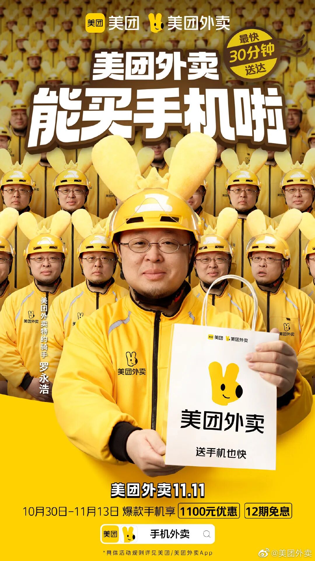同年双十一期间,又请来话题性人物罗永浩作为特约骑手(实际就是广告代言)为美团外卖双十一助阵,向大众告知“美团外卖上能点手机“,引发全网热议。
