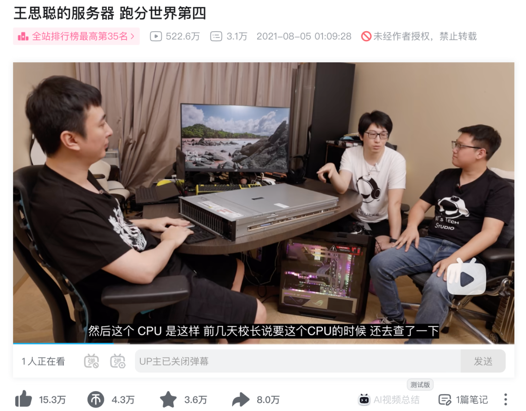 当然,装机区最传奇的故事,还是 B 站 UP 主@电丸科技 给王思聪配的电脑。王校长斥资百万配电脑,最终跑分全球排名第四的视频,让大量粉丝见识到了钞能力的威力。