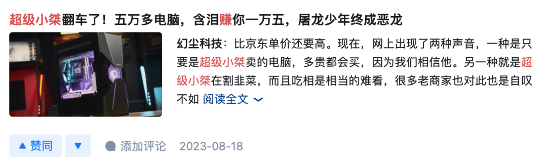 然而去年 8 月,@超级小桀 和朋友合作开了一家电脑装机店,结果极低的性价比,和“5 万元配置单”的割韭菜套装,让他被粉丝怒喷。