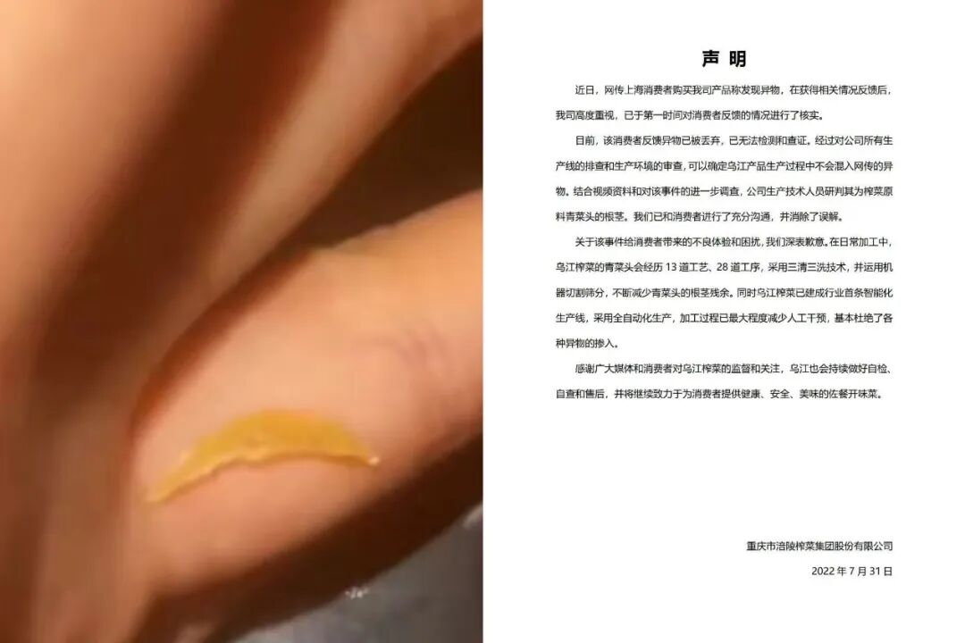 一波未平一波又起,同年7月,有消费者爆料称乌江榨菜里吃出脚指甲,掀起网络热议,后续官方解释称“公司生产技术人员研判其为原料青头菜的根茎,并与消费者进行沟通,消除了误会。”