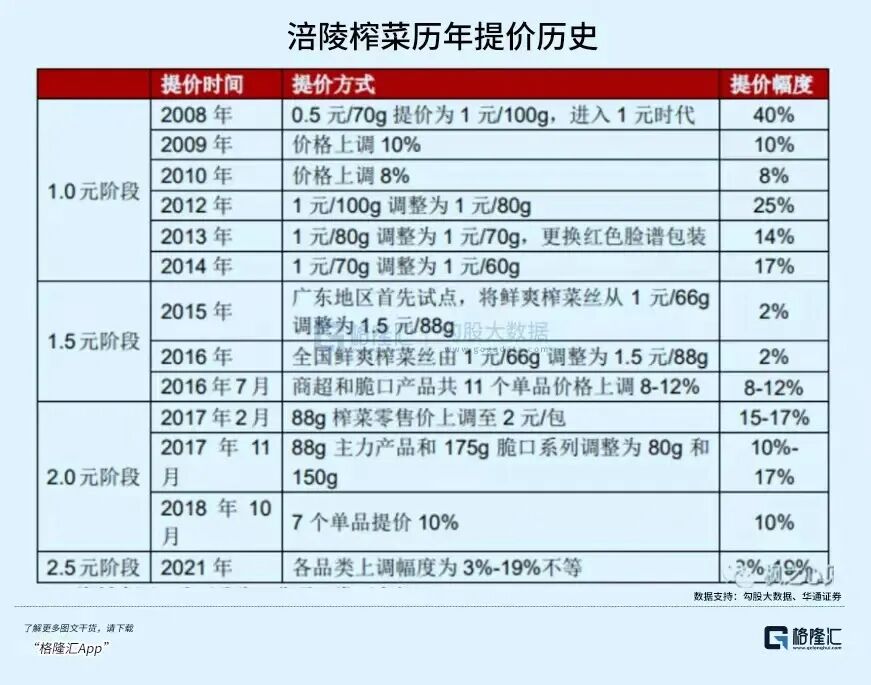 虽然保持着一年一涨价的频率,但1元时代从2008年持续到了2015年,接近8年的时间里,涪陵榨菜的提价策略总体是谨慎的。