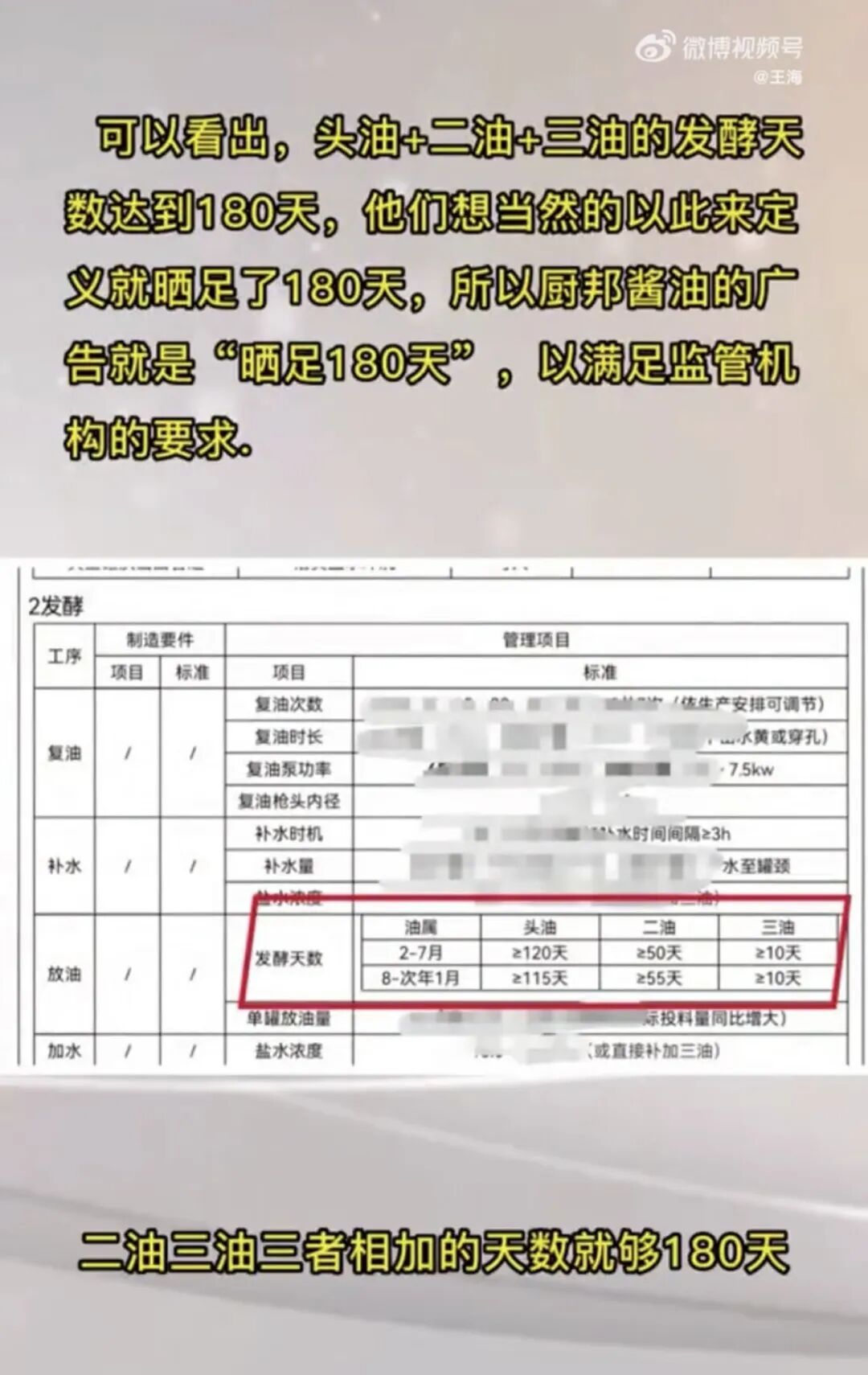 而所谓的“晒足180天”,其实是用120天的头油+50天的二油,再加上10天的三油凑够180天,实际该厨邦酱油晒的天数仅有80天左右。