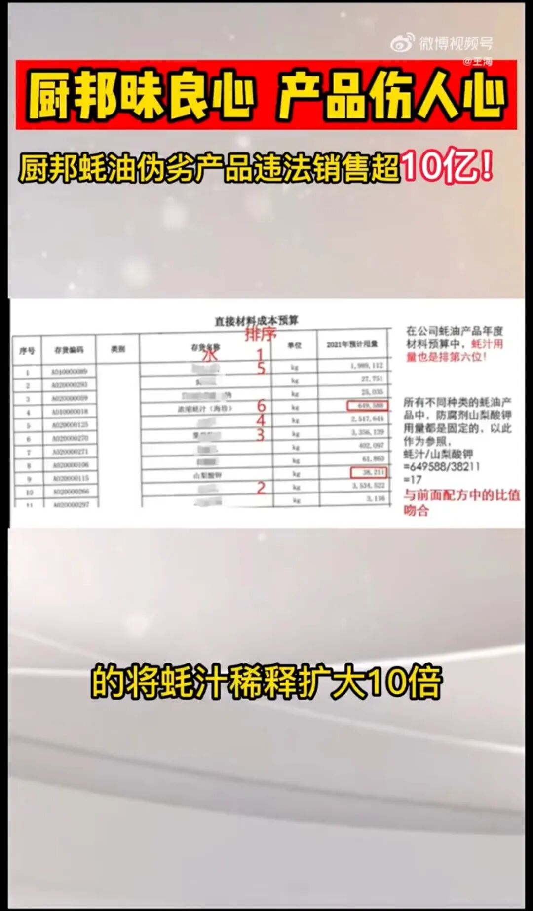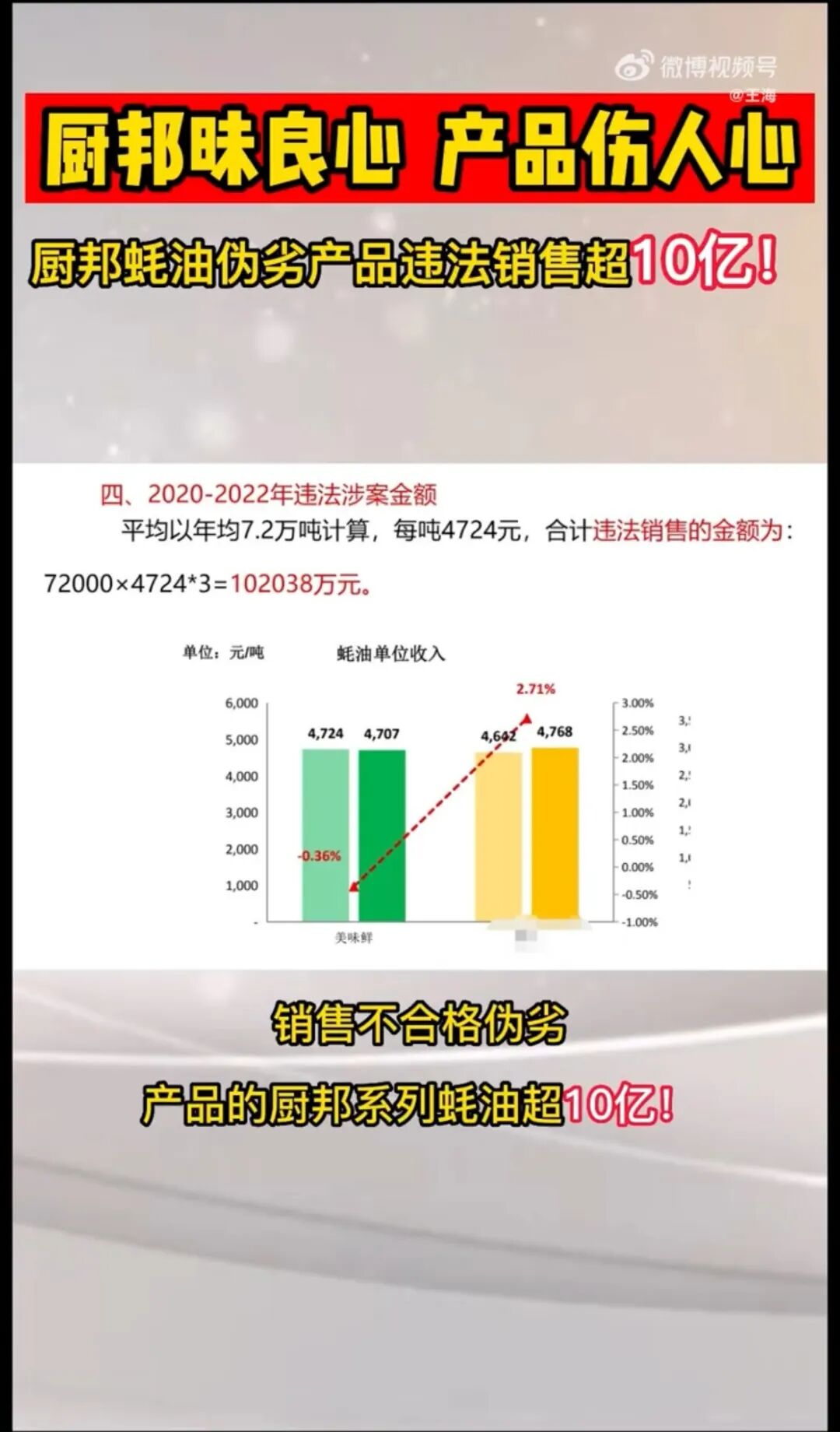 视频中还提到,从2020-2022年,通过生产销售劣质蚝油,美味鲜公司的违法销售额已经累计超过了10亿元。