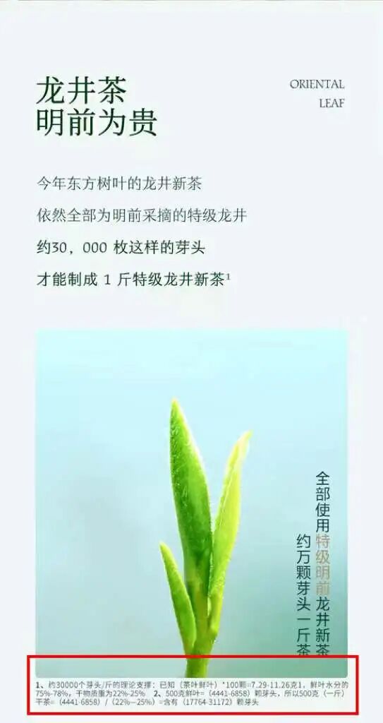 这时候东方树叶来了,明晃晃地叫卖自家的茶全部来自“地理标志产区的特级明前龙井”,还在宣传海报里专门给你讲解3000颗芽头的秘密。
