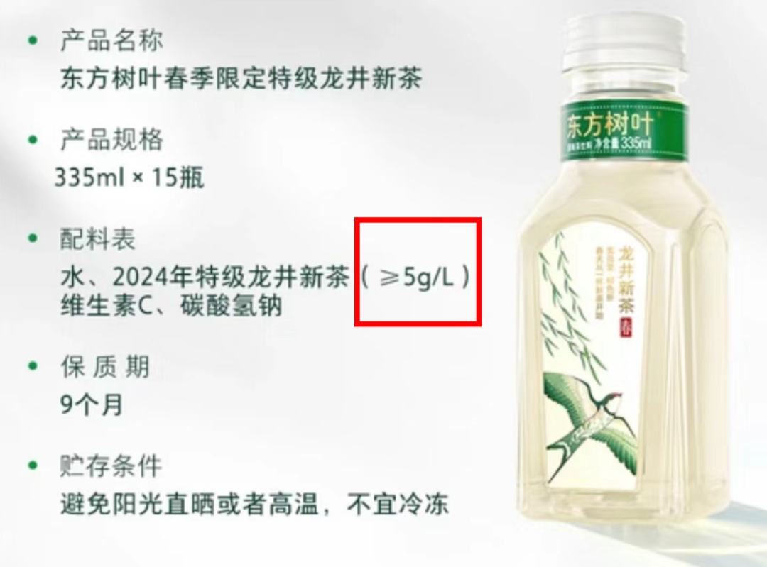 根据官方宣传,每升龙井新茶里含有大于等于5克的特级明前龙井。一瓶335ml,一箱15瓶,也就是一箱龙井新茶要消耗25.125g茶叶,今年的10万箱共需要2.5125吨(5025斤)。