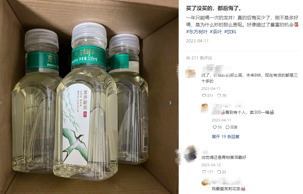 如今变了,再没有比东方树叶更备受关注的饮料了。东方树叶在4月1日售卖5万箱龙井新茶时,直接在社交平台上炸开了锅,17小时的售罄速度远远赶超上一年的一周。
