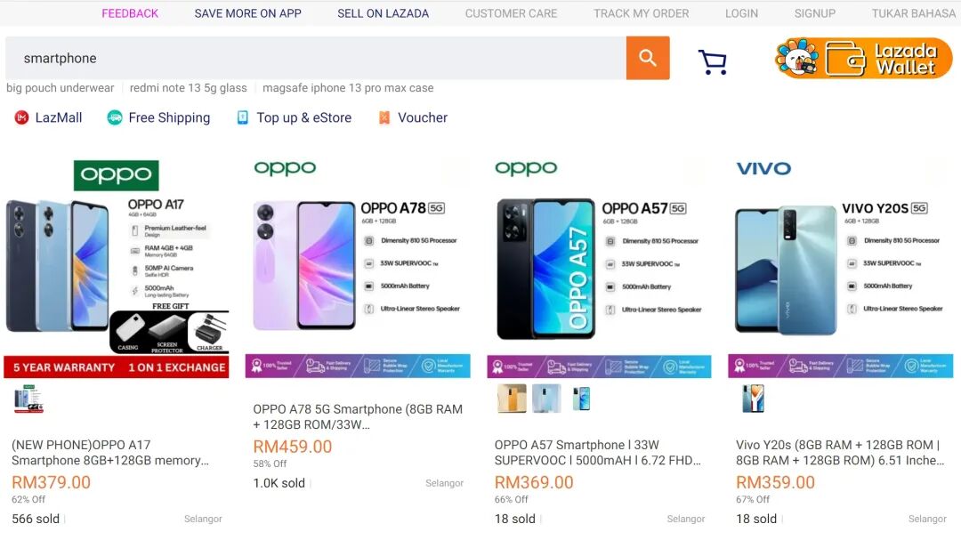 时至今日,打开东南亚电商平台Lazada,输入“smartphone”的关键词,出现在推荐顶端的手机价格仍在300-500马币,换算成人民币也不过六七百元,均在一千元以下。
