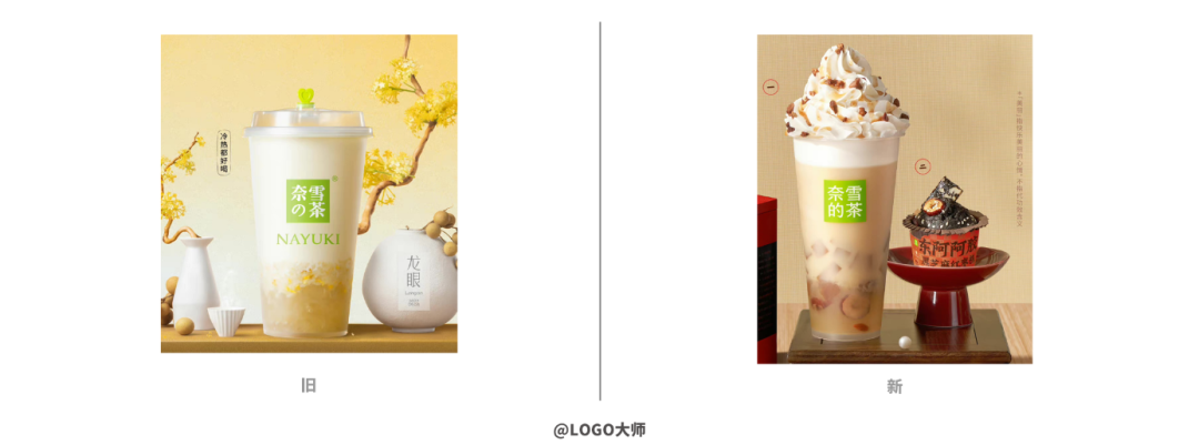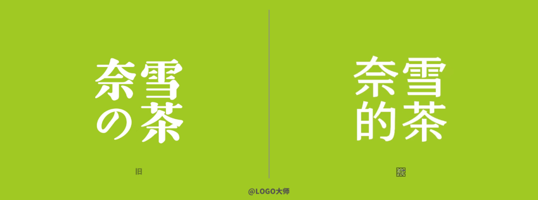 奈雪的茶旧LOGO是以绿色矩形框框为底,品牌名“奈雪の茶”以上下形式排列。新LOGO依旧采用了原本嫩绿的品牌色,以及一样的结构版式设计。只不过将原本带有日式色彩的符号“の”,改成了汉字“的”。
