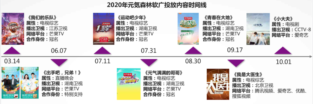 在2020年一年内,元气森林积极赞助了五个电视综艺节目、一场直播晚会以及一部热门电视剧,实现了全年无间断的高曝光率。