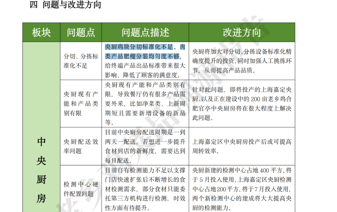 同时,老乡鸡也指出在专项行动中发现的问题。比如,在中央厨房的溯源过程中,老乡鸡发现分切、分拣标准化不足,易导致鸡块大小,和荤素分配不均匀。且大部分产品仍以冷冻形式进行储存,对于口感有一定的影响。