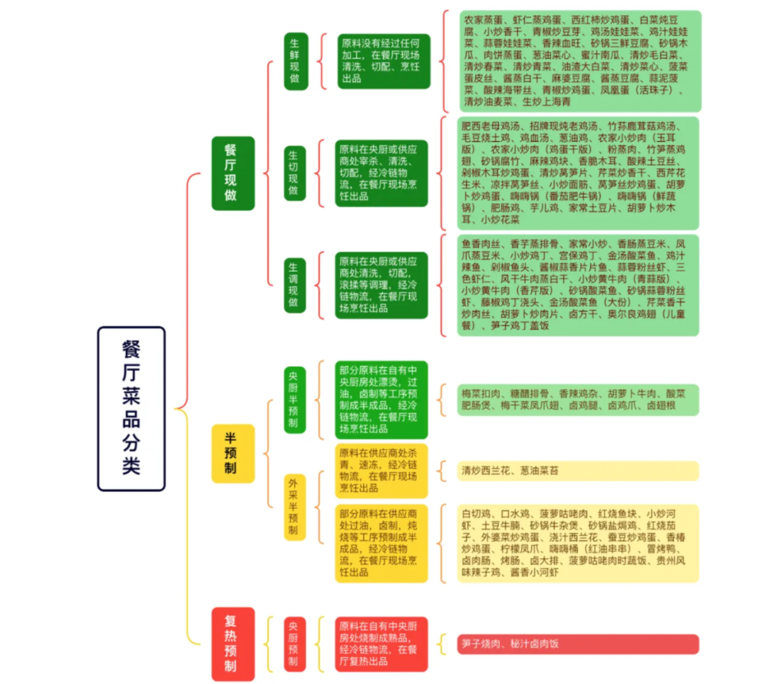 按照分类,肥鸡老母汤、农家蒸蛋、鱼香肉丝等菜品是餐厅现做;梅菜扣肉、卤鸡腿等属于半预制;笋子烧肉、秘汁卤肉饭属于复热预制。