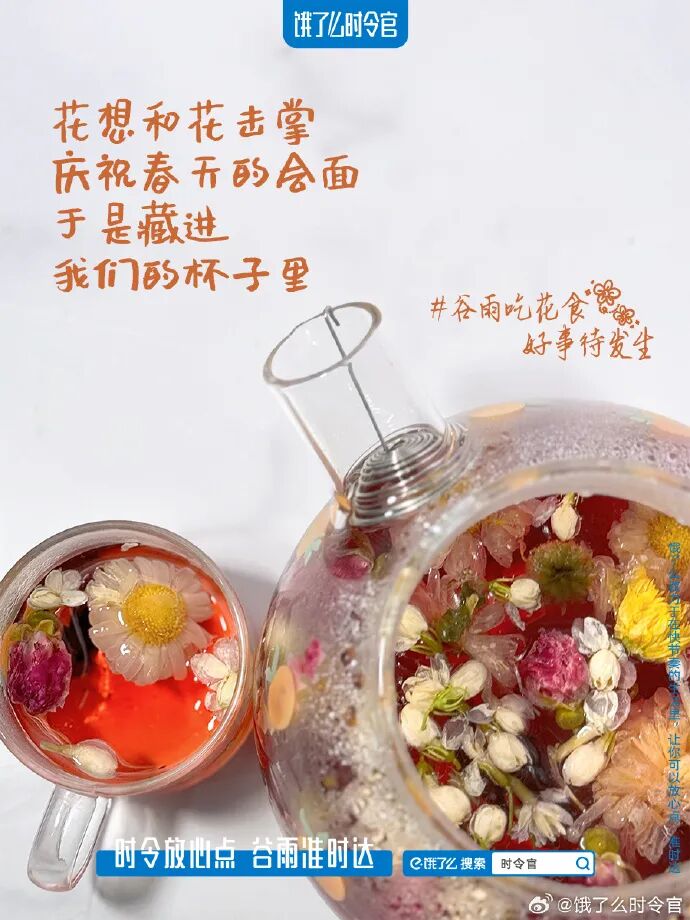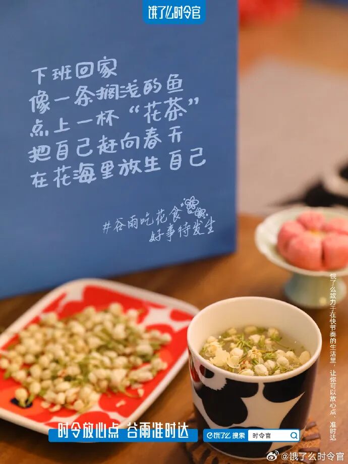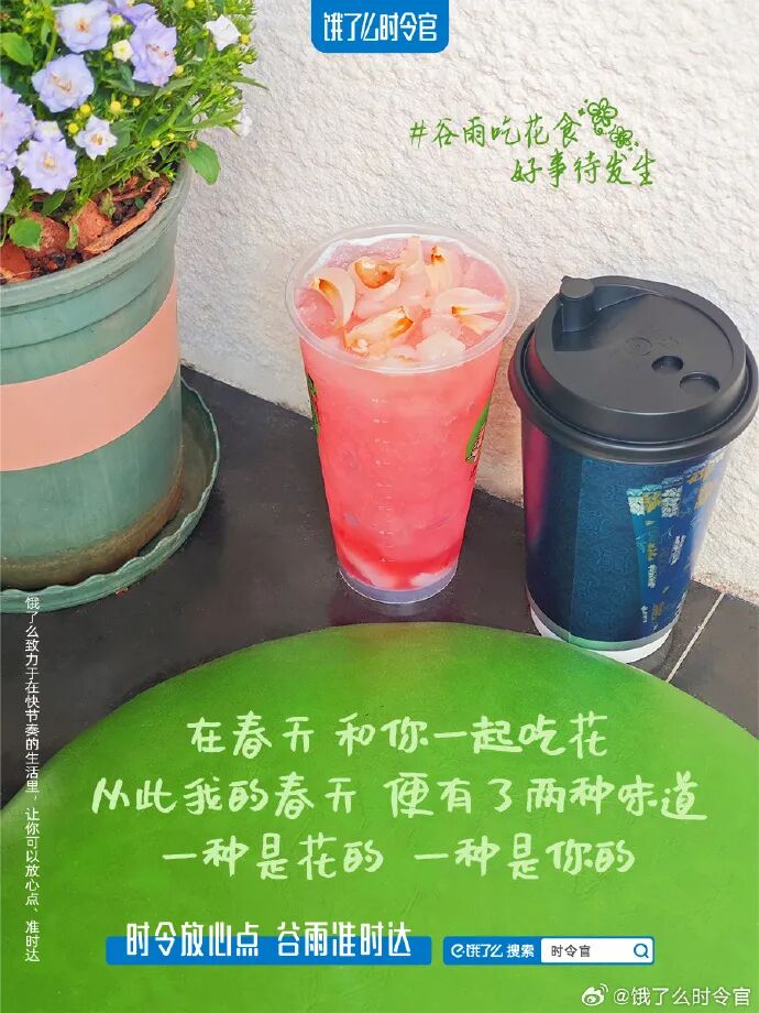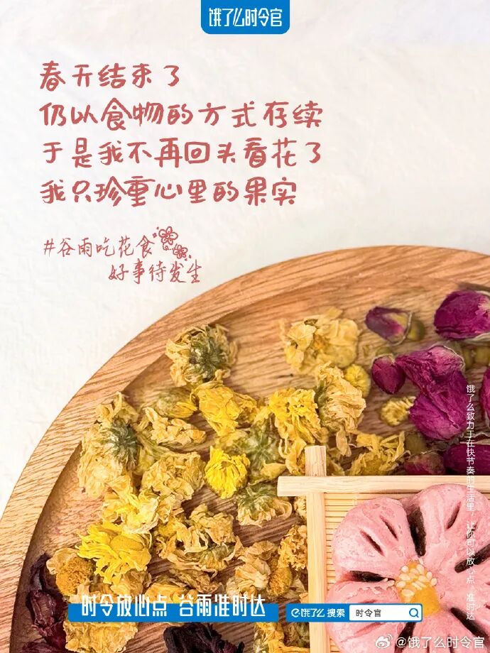 饿了么时令官深知这份对春天的眷恋情绪,于是在这雨水不休的季节里,推出一组谷雨与花食文案,给春天写一封浪漫的告白诗。