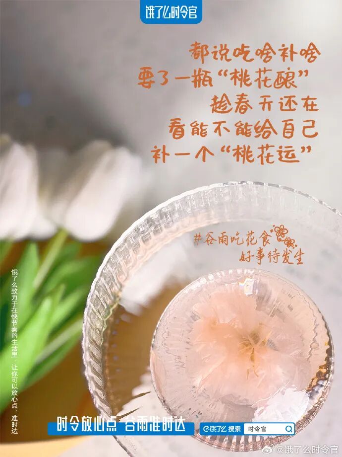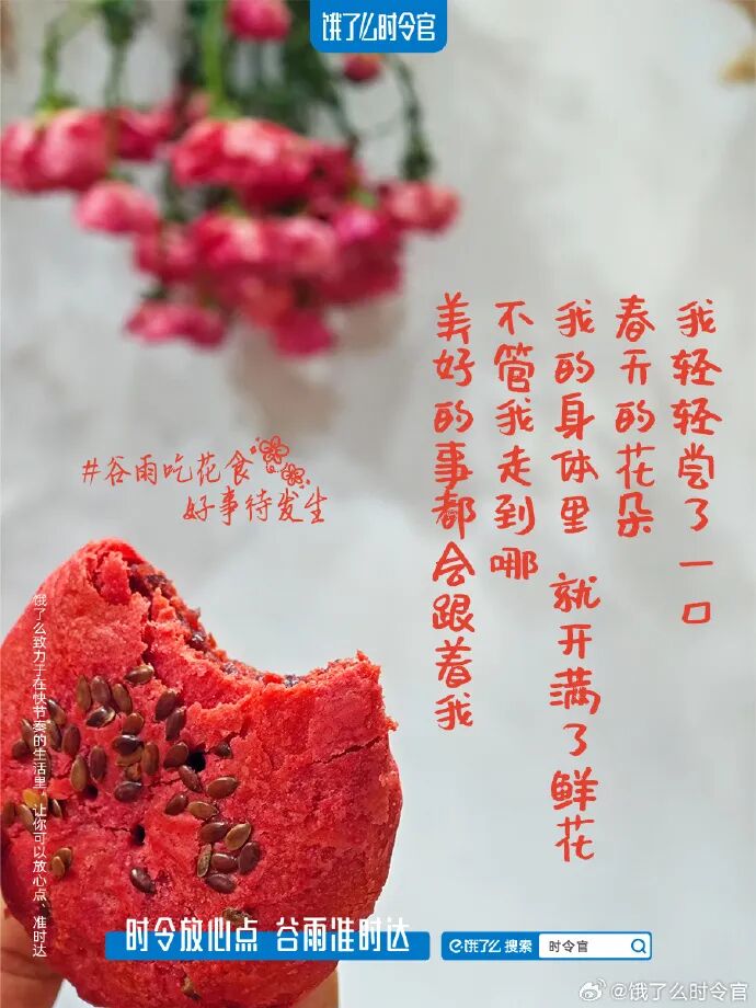 “为了留住春天,我们把它吃进肚子里。”饿了么谷雨文案,聚焦吃花食这一民间时令习俗,传达好事发生的美好寓意,趣味诠释春日浪漫。