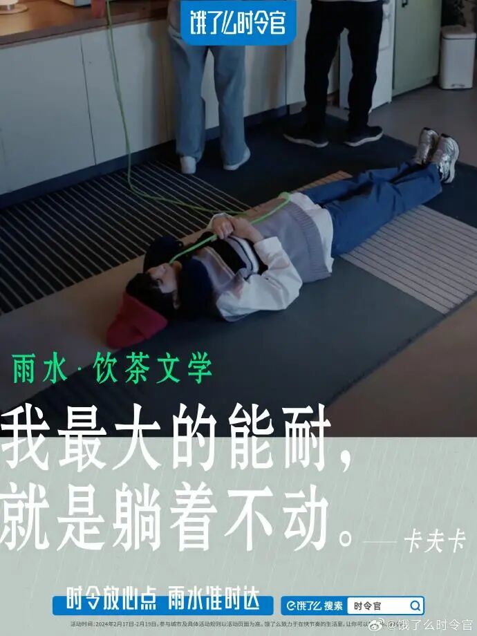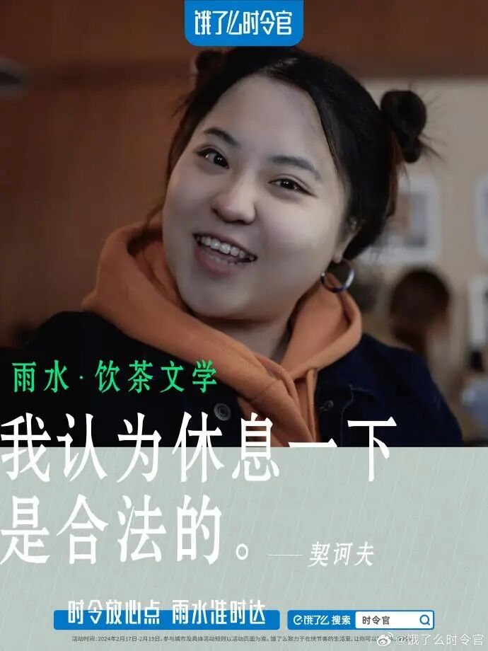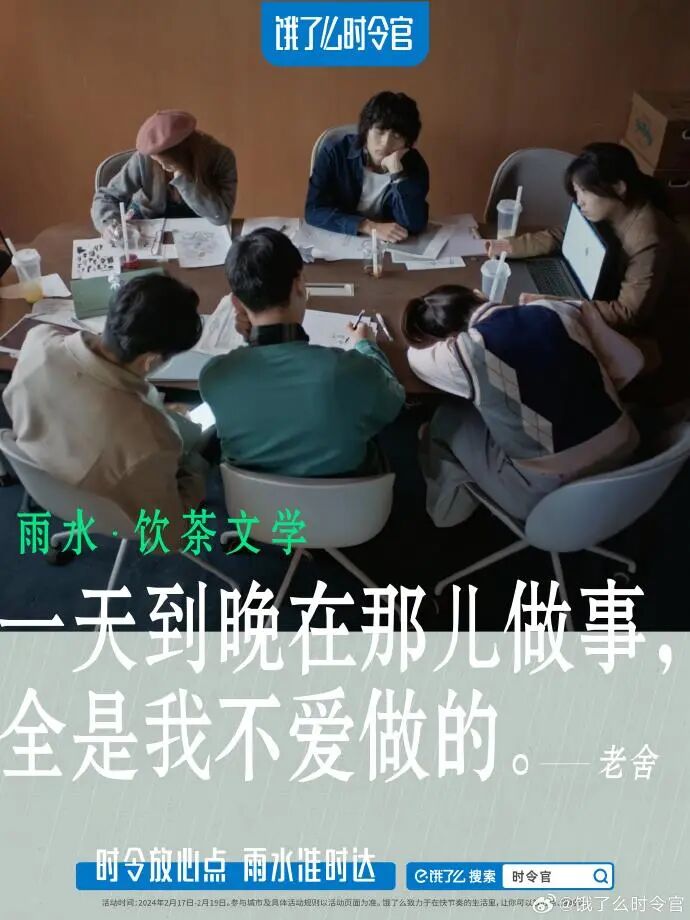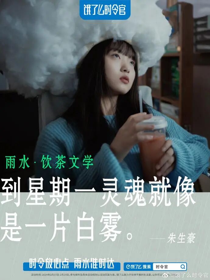 今年的雨水是春节开工第二天,还恰逢周一。饿了么洞察到打工人的“节后综合症状”,引用了众多文学大佬的“摆烂”哲学,推出《雨水饮茶文学》,将打工人的美丽精神状态演绎得淋漓尽致。