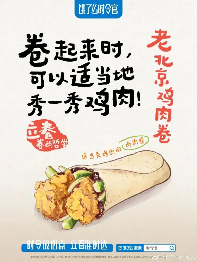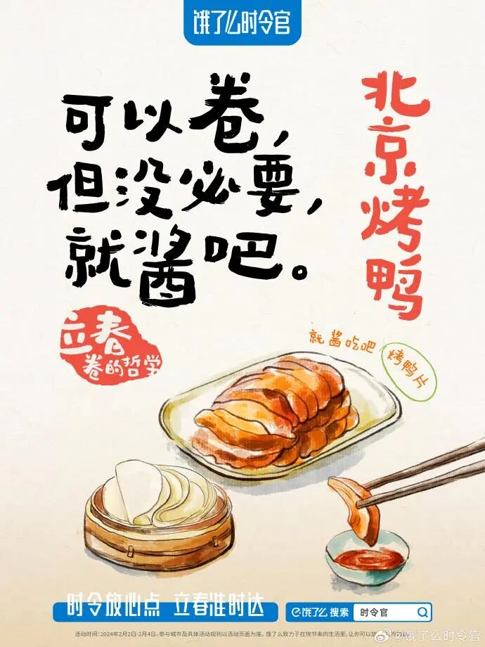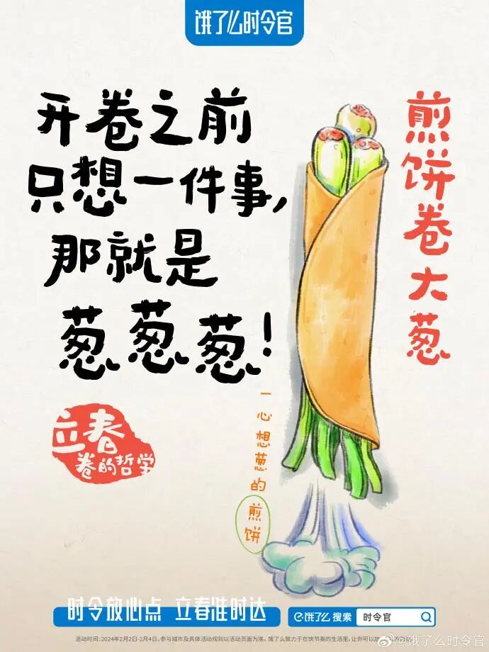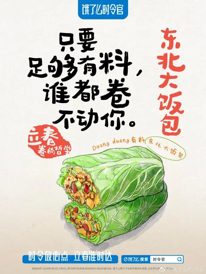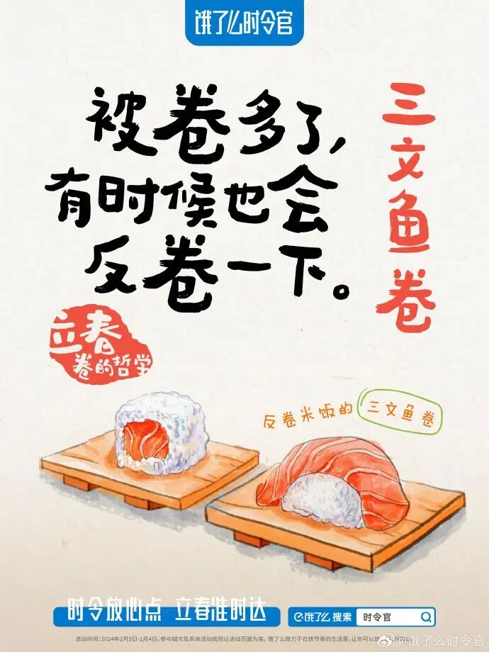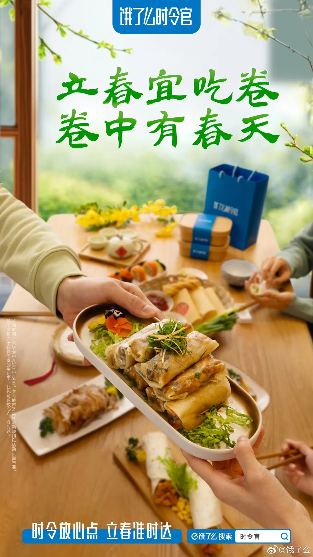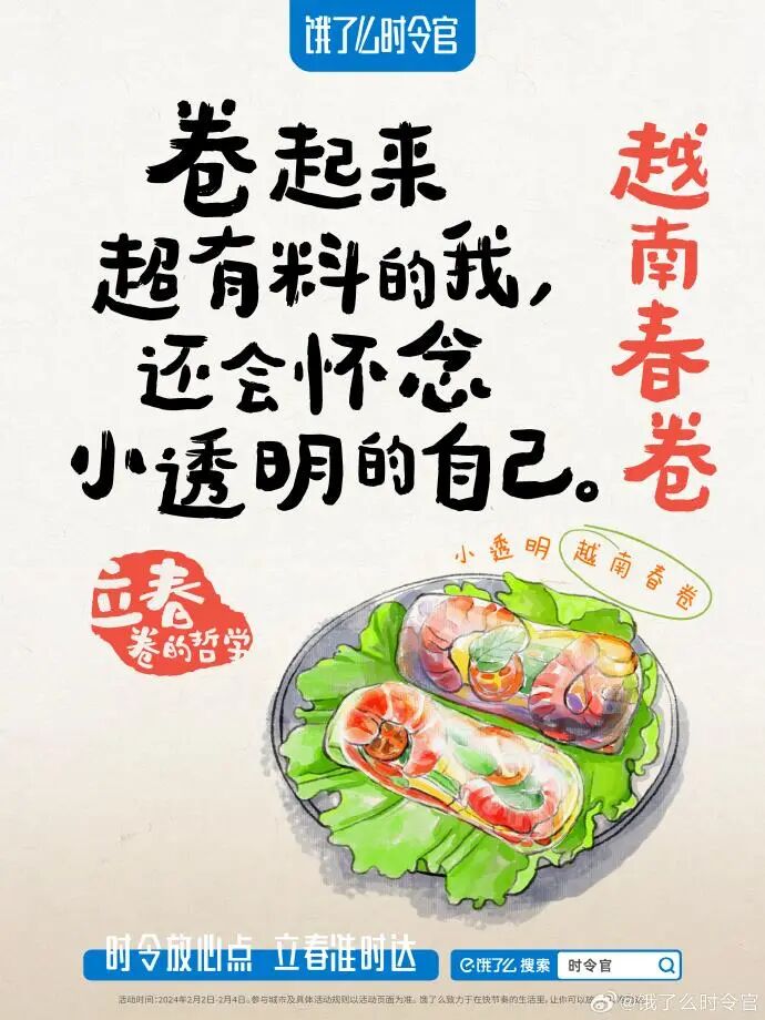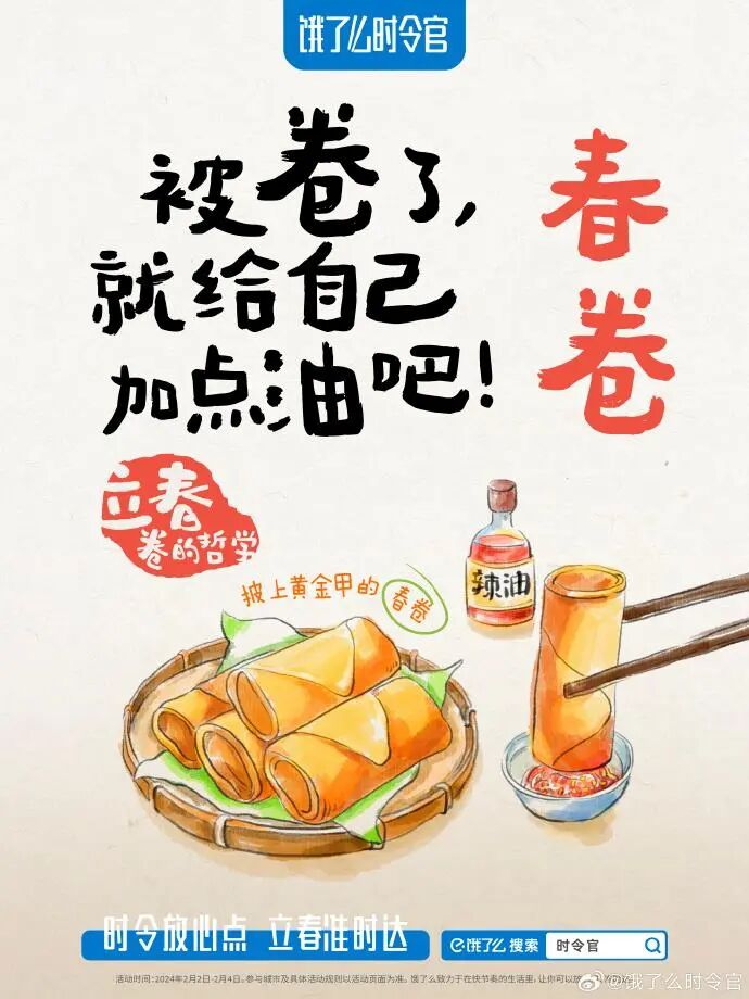 饿了么在立春这天,以卷类食物的视角,结合生活中与“卷”相关的有趣洞察,提出「立春 卷的哲学」,希望人们把生活的卷都在立春这天一口吃掉,精准拿捏打工人的躺平心态。