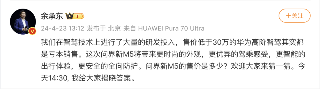 4月23日,华为常务董事、终端BG CEO、智能汽车解决方案BU董事长余承东在微博公开表示,“我们在智驾技术上进行了大量的研发投入,售价低于30万的华为高阶智驾其实都是亏本销售。”
